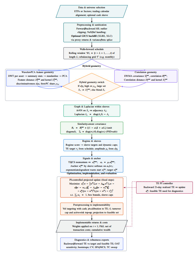 We introduced GATE-WPCA-PI—geometry-aware, tracking-error-controlled allocation with wavelet principle component analysis features and a proportional-integral controller—a practical portfolio construction framework that linked multi-scale market geometry to explicit, out-of-sample risk targeting. At each rebalance, the daily returns were embedded in a multi-resolution wavelet feature space and compressed via principal component analysis to form a similarity kernel. A simple discriminative-power score gated the optimizer: when the cross section was heterogeneous, the feature geometry was activated; when it was homogeneous, the method reverted to a correlation-only view. Allocations were obtained from an implementable mean–variance surrogate with (ⅰ) a geometry penalty that discouraged concentration in highly similar assets, (ⅱ) quadratic and absolute turnover costs, (ⅲ) an entropy floor, and (ⅳ) standard long-only, budget, and sleeve caps. A proportional-integral (PI) law treated the tracking error (TE) as a controllable state and steered realized TE toward a feasible band under trading frictions.