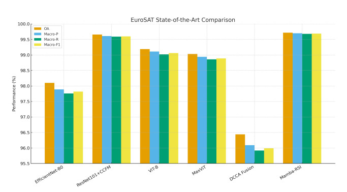 Accurate and efficient land-use and land-cover (LULC) classification from remote sensing imagery remains challenging. This is because it requires capturing long-range spatial dependencies while maintaining computational scalability. Recent transformer-based models improve global context modeling. However, they suffer from quadratic complexity and are limited in applicability to high-resolution imagery. We introduce Mamba-RSI: a linear-time, state-space deep learning framework using selective recursion, hierarchical multi-scale feature extraction, and lightweight global representations. Mamba-RSI captures both fine-grained spectral/texture information and coarse structural patterns with significantly less computational overhead than existing quadratic self-attention transformers. Extensive experimentation on EuroSAT and NWPU-RESISC45 demonstrated that Mamba-RSI achieves state-of-the-art performance. It achieved 99.72% accuracy on EuroSAT and 96.84% on RESISC45. This represents a +0.40% improvement over the strongest transformer baseline, ATMformer, on EuroSAT, a +0.29% improvement on RESISC45, and more than +0.53% over ViT-B on EuroSAT. Robustness tests under severe Gaussian noise ($ \sigma = 0.10 $) showed that Mamba-RSI maintains 97.43% accuracy. MaxViT, by comparison, maintains 94.01% in the same setting. Mamba-RSI also preserves 91.15% accuracy under 30% patch occlusion, outperforming ViT-B by +7.41%. Mamba-RSI provides an attractive blend of accuracy, robustness, and efficiency. It serves as a scalable foundation for new insights into remote sensing analytics and LULC mapping systems.