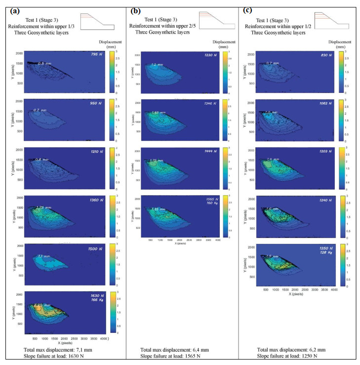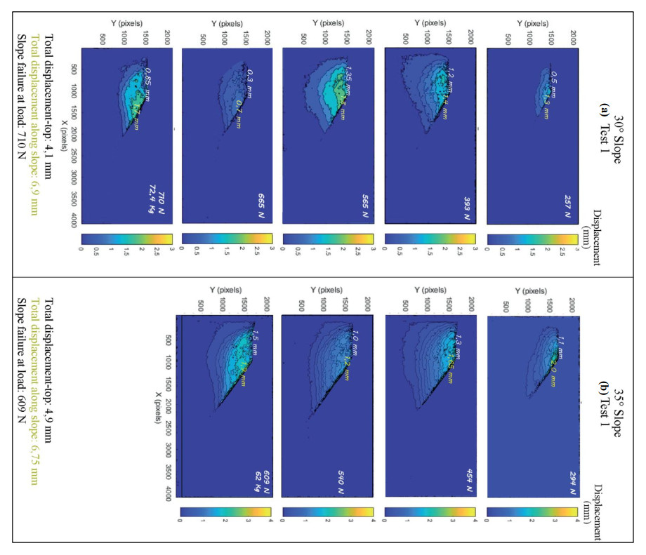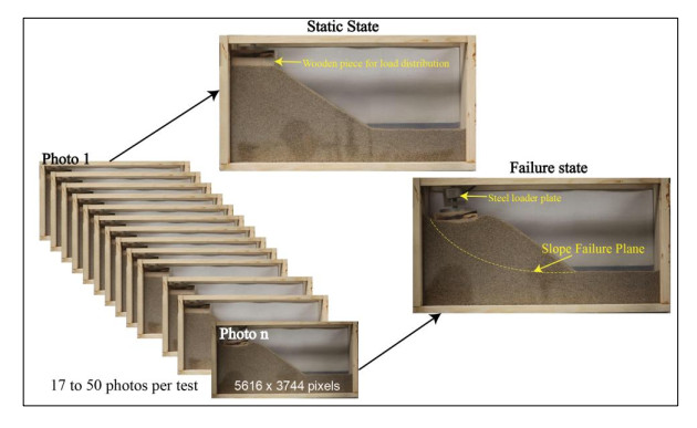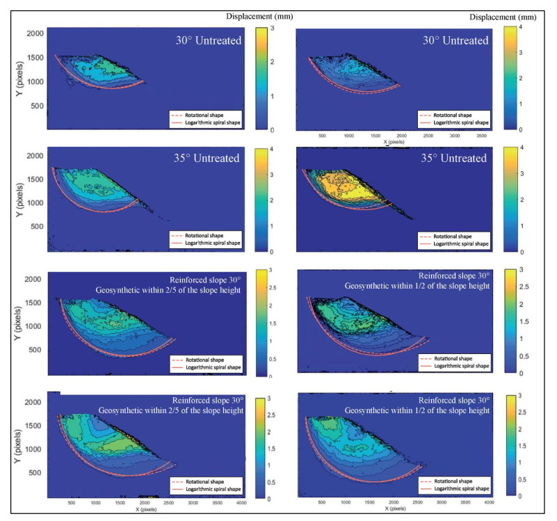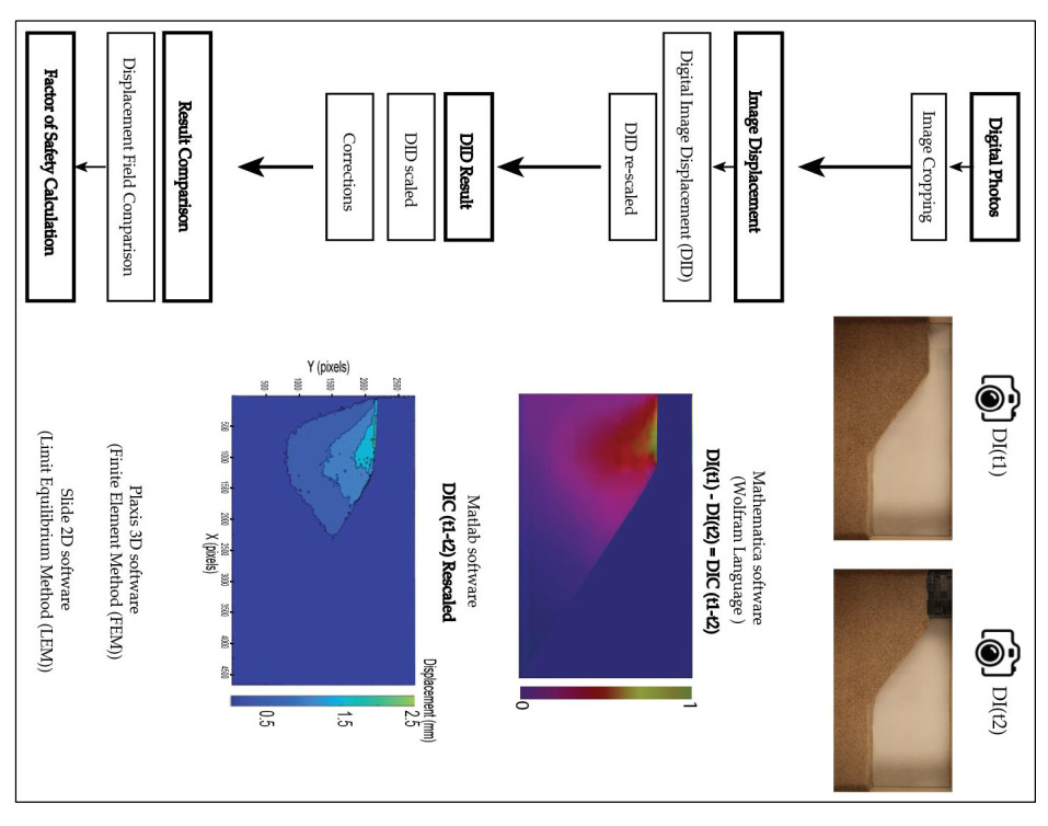 Slope failures have caused significant human casualties and economic losses worldwide, with impacts reaching billions of dollars annually. These failures underscore the critical need for effective slope stability analyses. In particular, the mining industry faces this risk due to the accumulation of waste in tailing dams, which have a history of catastrophic failures. This study introduces a novel approach to analyze slope displacement fields and failure surfaces using the Digital Image Displacement (DID) method for an optical flow analysis, combined with a MATLAB code for data correction, numerical verification through Finite Element Method (FEM), and Limit Equilibrium Method (LEM) analyses. This novel methodology in geotechnical applications provides high, pixel-level sensitivity, thus enabling the detection of small displacement fields over short time intervals and spatially localized motions necessary to track the initial development of progressive failure. Forty-one experiments were conducted on untreated and geosynthetic-reinforced sandy slopes, thereby using more than 700 high-resolution digital images to investigate failure shapes and displacement fields. The results revealed a logarithmic spiral failure shape for both untreated and reinforced slopes, with reinforced slopes exhibiting deeper and more pronounced rupture surfaces. Geosynthetic reinforcement significantly improved the slope stability, which resulted in the Factor of Safety (FS) increase for 30° slopes from 1.2 to over 3 and increasing load-bearing capacity (up to 1700N) while reducing displacements. Additionally, the study emphasized the critical influence of slope geometry and compaction on the overall stability, thereby identifying closer reinforcement spacing (e.g., within one-third slope height) as the most effective design configuration to maximize stabilization. These findings offer valuable insights into the slope behavior, improve the precision of displacement measurements, and advance geotechnical engineering practices for enhanced risk mitigation and slope stability analyses.