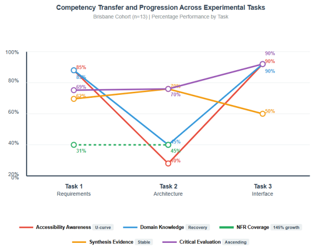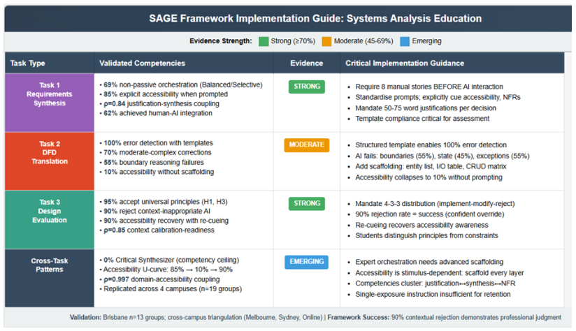 Generative AI orchestration competencies, the abilities to evaluate, adapt, and integrate AI outputs with human judgment, remain inadequately addressed by general AI literacy frameworks. This paper applies and extends the SAGE (Structured AI-Guided Education) framework to systems analysis and design education through three experimental assessments targeting requirements synthesis, formal modelling correction, and design evaluation. In the Brisbane baseline cohort ($n = 13$ groups), 84% demonstrated selective and justified AI use (Balanced Integrator or Selective Adapter), and no group reached expert-level synthesis; the subsequent cross-campus cohorts (n = 5 groups, yielding $N = 18$ template-compliant groups analysed overall out of 21 participating groups) corroborated these patterns. Students consistently recognised accessibility needs when working with user requirements and interface designs, but almost entirely neglected them when producing system architecture diagrams, suggesting that this competency depends on continuous prompting rather than transferring automatically between tasks. When AI was used to generate formal data flow diagrams from the students' specifications, the resulting errors were not random but clustered around system boundary classification, exception handling, and data lifecycle completeness. These findings carry implications for how educators structure AI collaboration in technical curricula, particularly regarding the sequencing of human and AI contributions, the need for stage-specific scaffolding, and the role of explicit justification in developing professional judgment.
