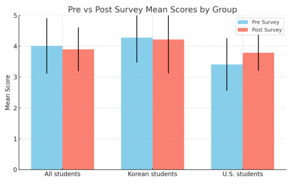 • Fostering engagement and persistence in science, technology, engineering, and mathematics (STEM) among adolescents is critical for preparing future professionals in a rapidly evolving technological landscape. This study evaluated the impact of the Youth Development Program (YDP 2025), a cross-cultural STEM initiative involving high-achieving middle and high school students from the United States (n = 21) and South Korea (n = 13). The program provided immersive experiences, including mentorship, collaborative projects, research presentations, coding challenges and robotics workshops, and interactions with leading scientists, including Nobel Laureates. A mixed-methods approach was employed to examine program outcomes. Quantitative measures assessed students' STEM affinity before and after the program using Likert-scale surveys, analyzed with descriptive statistics and Welch's t-tests; effect sizes were calculated to estimate the magnitude of change. Unequal pre- and post-survey response rates limited the feasibility of paired analyses. Qualitative data from open-ended post-survey responses were analyzed thematically to capture participants' perceptions of learning outcomes, confidence, and future STEM aspirations. Results indicated minimal overall change in STEM affinity. U.S. students demonstrated a moderate increase (Cohen's d = 0.55), while Korean students showed little improvement. However, qualitative findings revealed substantial gains in practical skills (robotics programming, coding challenge, oral research presentations), confidence in STEM tasks, and motivation toward STEM careers. Participants emphasized mentorship, hands-on activities, and exposure to STEM professionals as particularly influential. Findings suggest that experiential STEM programs can enhance skills, confidence, and career-oriented motivation. Future iterations should expand hands-on challenges, integrate structured career exploration, and address language accessibility to maximize impact.