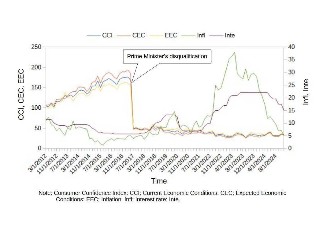 This study elucidates the nuanced relationship between consumer confidence and economic indicators, particularly amidst political instability. Prior to political uncertainty, consumer confidence reflected positive economic trends. However, political turmoil triggered a decline in confidence due to economic deterioration, inflationary pressures, and rising financing costs. The Prime Minister's disqualification due to corruption charges further eroded public trust and diminished economic activity. Post-pandemic, skepticism regarding the state's ability to address economic challenges has weakened confidence in governmental institutions and policies. Such insights are indeed crucial when evaluating consumer sentiment and its implications for market behavior.
