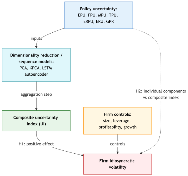 This study examines how multidimensional policy-related uncertainty influences firm-specific risk by integrating econometric analysis with interpretable deep learning. Using daily stock-level data for Nikkei 225 firms from 2000–2023, we construct measures of idiosyncratic volatility (IVOL) and combine them with a multisource policy uncertainty index capturing seven domains: economic, fiscal, monetary, trade, exchange rate, energy-related, and geopolitical risk. To model nonlinear interactions and temporal persistence across uncertainty dimensions, we employ a long short-term memory (LSTM) autoencoder and benchmark its performance against principal component analysis (PCA) and kernel PCA (KPCA). The LSTM-based composite index exhibits the strongest explanatory power, showing that higher policy uncertainty systematically amplifies IVOL. Model transparency is ensured through SHapley Additive exPlanations (SHAP), which highlight fiscal, monetary, and geopolitical uncertainty as the dominant contributors. Heterogeneity analyses reveal that the sensitivity of IVOL to uncertainty varies by sector, firm size, and profitability. To evaluate external validity, we extend the analysis to several advanced and emerging markets, including the United States, Germany, South Korea, India, and Indonesia, and find a consistent uncertainty-IVOL relationship, with Japan displaying the highest sensitivity. The results underscore the value of combining deep learning with explainable artificial intelligence (AI) for financial risk assessment in uncertainty-driven environments.