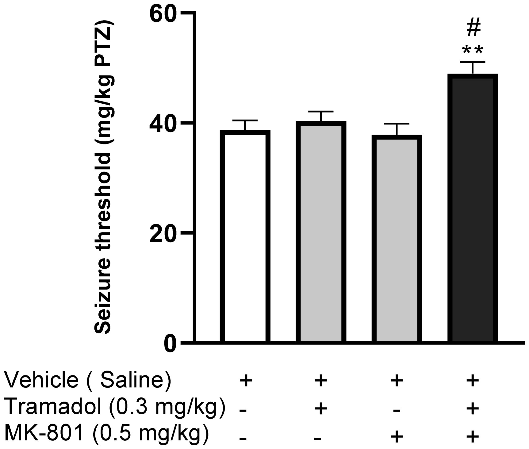 Tramadol (1–100 mg/kg) increased PTZ-induced seizure threshold in a dose-dependent, time-independent manner, with optimal anticonvulsant effect at a dose of 100 mg/kg. Acute administration of either ketamine (0.5 mg/kg) or MK-801 (0.5 mg/kg) potentiated the anticonvulsant effect of a subeffective dose of tramadol (0.3 mg/kg).