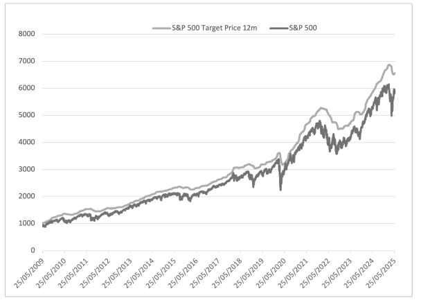 It is sometimes acknowledged that (sell-side) equity analysts' recommendations influence investors and therefore market prices. In particular, the S&P 500 is expected to decline (or rise) when analysts revise their targets downward (upward, respectively). Our findings indicate not only that the analysts' consensus exert no influence on market prices, but also that, conversely, analysts appear to set their target prices based on markets prices. Employing a kinetic theory framework, we model the dynamics of the analysts' opinions, by taking both the mutual influences shaping price consensus and the dynamics of the actual S&P 500 index level into account. The model is calibrated on a training subset of data and tested on an independent set to assess its predictive power. Our tests show that just three free parameters are enough to accurately predict the one-year average price forecasts of analysts.