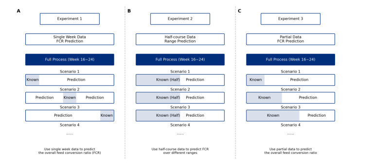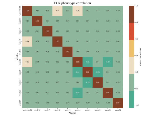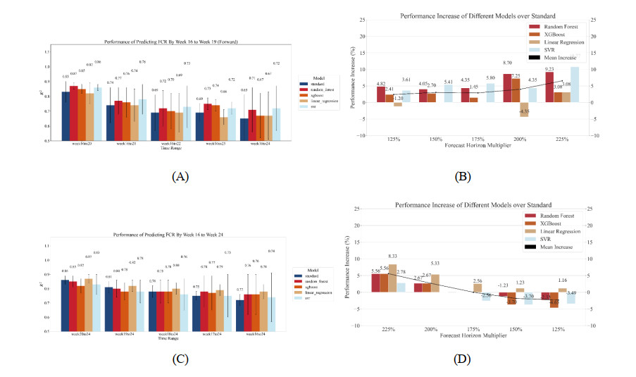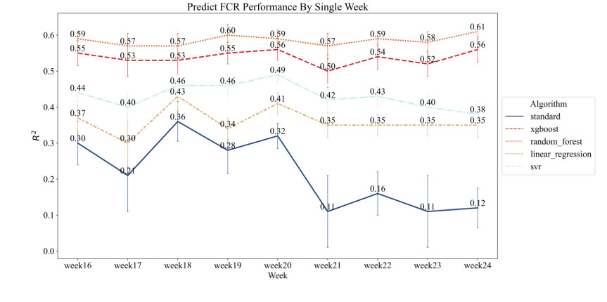 The correlation between the FCR of each week and the entire duration FCR was weak, and the entire duration FCR may be affected by a combination of factors rather than just a single week. When using data from a single week to predict the entire duration FCR, RF showed the most stability and accuracy of all models. When using data from the first and second halves to predict the FCR over different time horizons, the predictive performance of all models declined as the prediction span increased. Among them, RF and SVR had better prediction performances across the time windows. Notably, when using the latter half of the data for prediction, the LR model had the best prediction performance.
