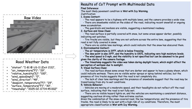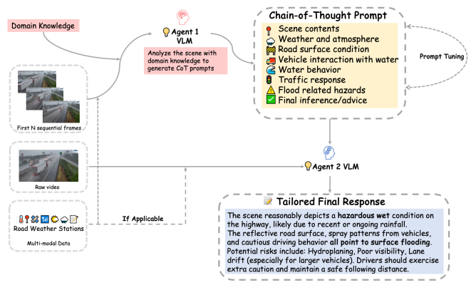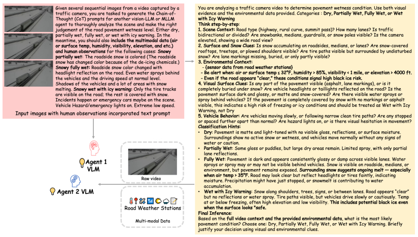 This paper introduces a multi-agent framework for comprehensive highway scene understanding, designed around a mixture-of-experts strategy. In this framework, a large generic vision-language model (VLM), such as GPT-4o, is contextualized with domain knowledge to generate task-specific chain-of-thought prompts. These fine-grained prompts are then used to guide a smaller, efficient VLM in reasoning over short videos, along with complementary modalities as applicable. This framework simultaneously addresses multiple critical perception tasks including weather classification, pavement wetness assessment, and traffic congestion detection, which achieve robust multi-task reasoning while balancing accuracy and computational efficiency. To support empirical validation, we curated three specialized datasets aligned with these tasks. Notably, the pavement wetness dataset is multimodal, combining video streams with road weather sensor data, highlighting the benefits of multimodal reasoning. Experimental results consistently demonstrate the strong performance across diverse traffic and environmental conditions. From a deployment perspective, the framework can be readily integrated with existing traffic camera systems and strategically applied to high-risk rural locations, such as sharp curves, flood-prone lowlands, and icy bridges. By continuously monitoring the targeted sites, the system enhances situational awareness and delivers timely alerts, even in resource-constrained environments.