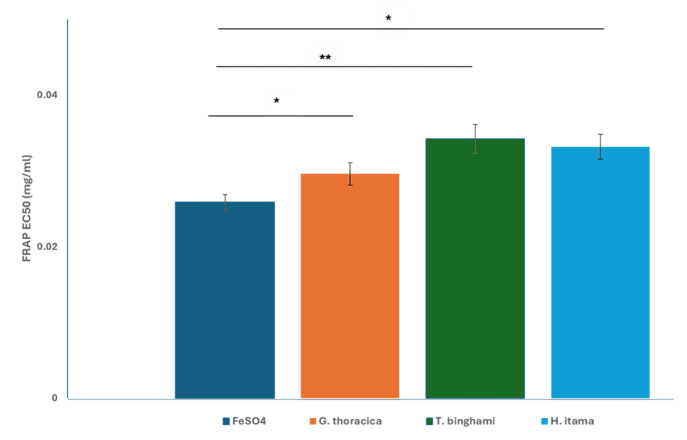 Propolis derived from stingless bees is recognized for its rich bioactive composition and potential health-promoting properties. This study evaluated the phytochemical profile and antioxidant capacity of propolis extracts obtained from three Malaysian stingless bee species: Geniotrigona thoracica, Heterotrigona itama, and Tetrigona binghami. Gas chromatography–mass spectrometry (GC–MS) analysis identified diverse bioactive constituents and revealed marked compositional variations among the species examined. Antioxidant activities were assessed using DPPH, ABTS, and FRAP assays. All extracts exhibited strong antioxidant potential, as reflected by favorable IC₅₀/EC50 values in the DPPH assay and consistent performance in the ABTS and FRAP assays. Significant correlations between antioxidant capacity and total phenolic and flavonoid contents indicated that phenolic compounds are the principal contributors to the observed effects. Overall, these findings demonstrate that Malaysian stingless bee propolis represents a valuable source of natural antioxidants and bioactive phytochemicals, underscoring its potential as a health-promoting and nutraceutical agent.