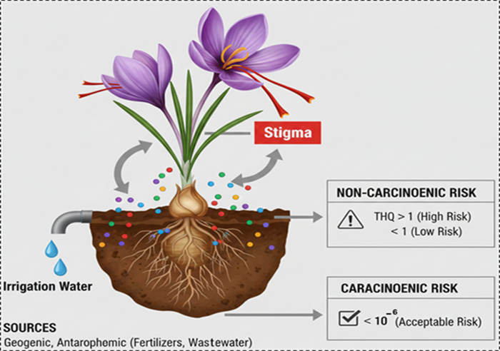 Saffron (Crocus Sativus L.), particularly its stigma, is a valuable global spice and medicinal plant. However, understanding the comprehensive process of trace element uptake and accumulation across all its plant parts, from soil to stigma, is crucial for ensuring food safety and assessing potential health risks. This study aimed to conduct a detailed health risk assessment of trace elements in different components of the saffron plant (stigma, leaves, petals, corms, stems), alongside and analysis of cultivation soil and irrigation water (total samples = 70). The investigation focused on quantifying element concentrations, evaluating their translocation dynamics within the plant, and assessing the associated human health risks through dietary exposure.