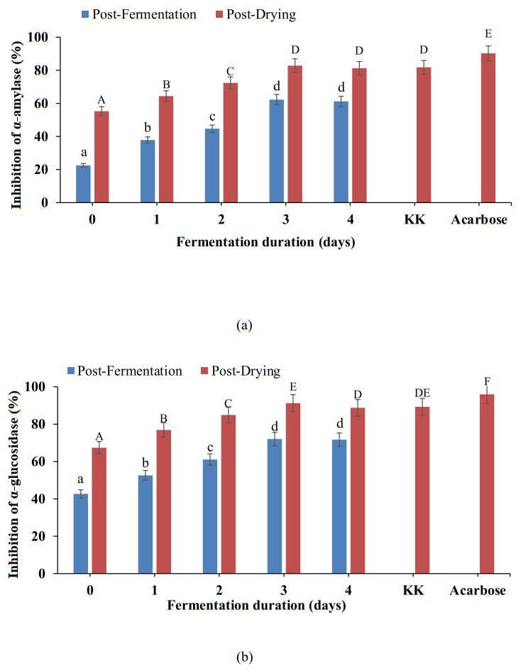 Sargassum hystrix is a brown seaweed that shows potential antidiabetic activity through its phenolic and phlorotannin compounds. The use of S. hystrix as a functional food is constrained by the stability of bioactive compounds and a fishy odor that reduces consumer acceptance. Fermentation is a processing method that plays a role in improving the sensory quality, functional characteristics, and biological activity of products. This study aimed to evaluate the effect of fermentation duration using Lactobacillus plantarum on antidiabetic activity and consumer acceptance level of S. hystrix tea. The fermentation process was carried out for 0, 1, 2, 3, and 4 days under microaerophilic conditions at 37 ℃. The results showed that the highest increase in functional characteristics was obtained on the third day of fermentation, marked by higher phenol content (12.94 ± 0.68 mg GAE/g), phlorotannin (14.60 ± 0.95 mg PGE/g), and inhibition activity of α-amylase (82.80% ± 1.70%) and α-glucosidase (91.26% ± 0.44%) than those of other experimental treatments. Sensory evaluation showed that longer fermentation duration reduced the taste and fishy odor of S. hystrix tea. The third day of fermentation treatment yielded the highest acceptance scores for aroma, taste, and overall product. Therefore, a 3-day fermentation duration is recommended as the optimal condition to produce S. hystrix tea with enhanced functional and sensory qualities.