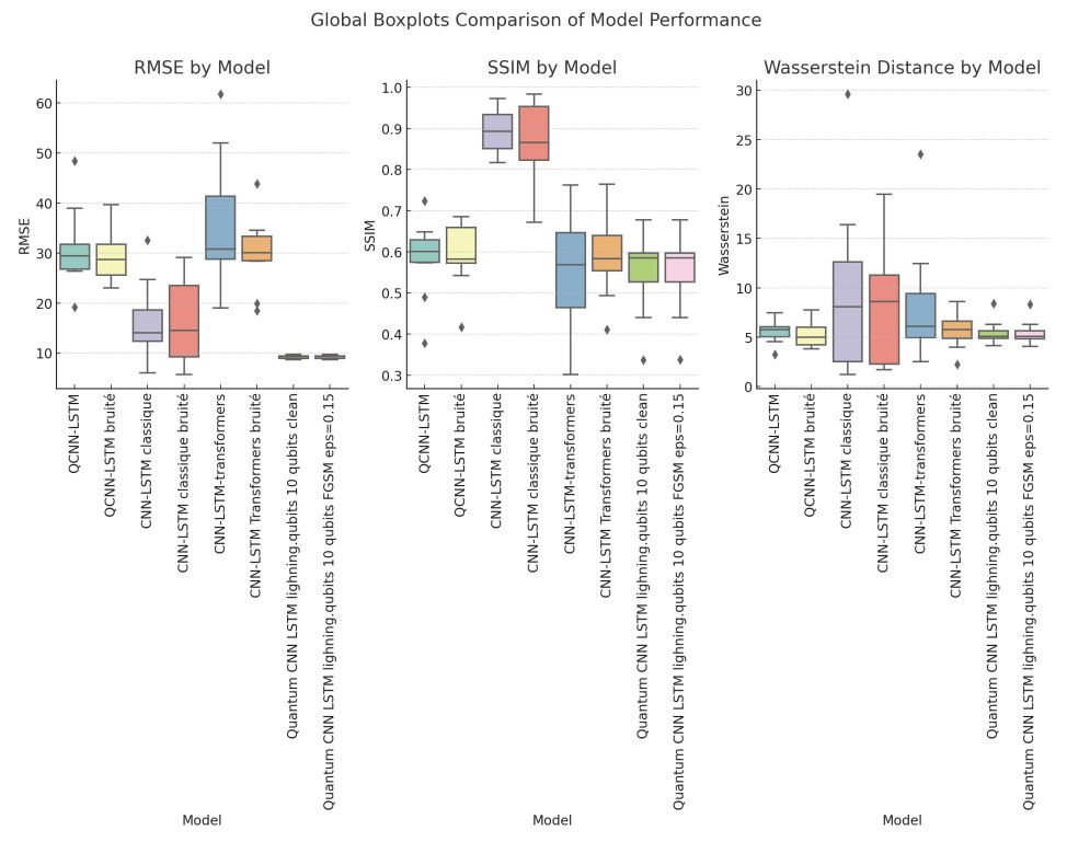 We present a quantum-enhanced deep learning framework for short-term forecasting of extreme convective weather systems, specifically targeting the formation of bow echo structures through prediction clouds. Our approach integrates a quantum convolutional neural network (QCNN) into a classical convolutional neural network-long short-term memory (CNN-LSTM) pipeline, incorporating a 10-qubit variational quantum circuit executed on the lightning.qubit simulator. The model is trained using heterogeneous meteorological data (satellite images, convective available potential energy (CAPE) fields, lightning activity) from the extreme storm that hit the Corsican coast on August 18, 2022, preceding the convective event and evaluated during the critical intensification window (0700–0800 h). We compare this hybrid quantum model with classical CNN-LSTM and CNN-LSTM-Transformer architectures using three complementary metrics: Root mean squared error (RMSE), structural similarity index (SSIM), and Wasserstein distance. The quantum model demonstrates superior robustness to input noise and adversarial perturbations fast gradient sign method (FGSM), maintaining spatial coherence and stable prediction under degradation. These findings highlight the capacity of quantum circuits to encode more resilient representations for meteorological inference. This study provides a concrete application of hybrid QCNN architectures in the domain of extreme weather forecasting and lays the groundwork for future integration of topological data analysis to assess the preservation of topological features in quantum predictions.