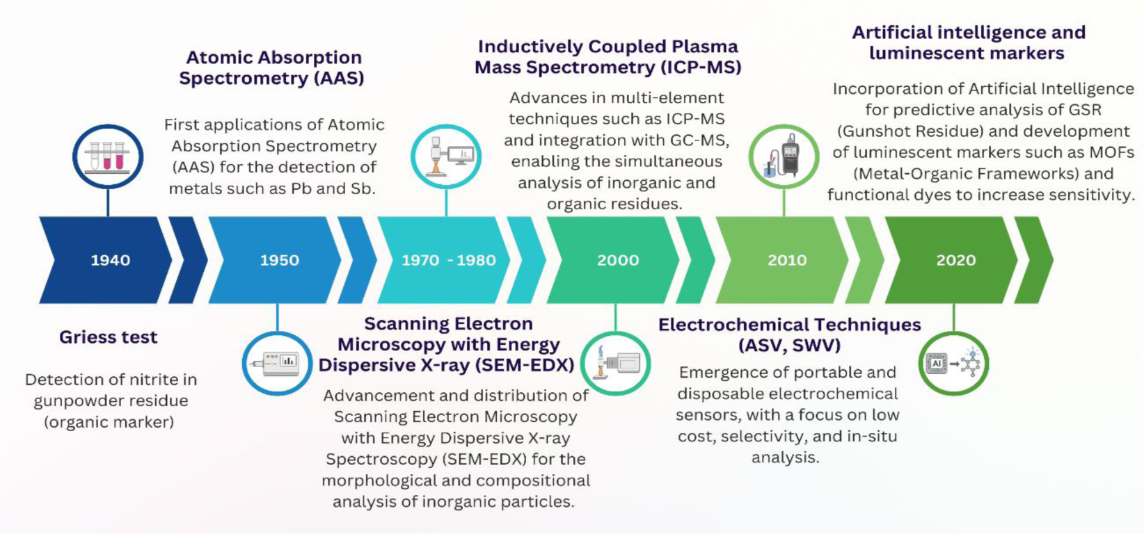 This paper addresses the main methods of chemical analysis of gunshot residues (GSRs), highlighting both their social and forensic relevance. Forensic authorities have determined that crimes involving firearms, including homicides and suicides, constitute a significant portion of the cases examined. In these cases, GSR plays a central role in the reconstruction of crimes. Classical instrumental techniques such as atomic absorption spectroscopy (AAS) and scanning electron microscopy with energy-dispersive X-ray spectroscopy (SEM-EDX) remain widely used; however, recent advances have introduced innovative approaches including electrochemical sensors, portable devices, and luminescent metal–organic frameworks (MOFs). The objective of these novel methodologies is to enhance sensitivity, selectivity, and accessibility in forensic analysis. The objective of this article is to provide a critical overview of the historical development, current practices, and recent technological innovations in GSR detection. The text places particular emphasis on the challenges posed by heavy-metal-free “green” ammunition and highlights perspectives where electrochemistry, chemical markers, and artificial intelligence (AI) can enhance the robustness of forensic investigations. The primary findings indicate that the amalgamation of nanomaterials, portable platforms, and chemometric instruments possesses the capacity to transform the domain of GSR analysis, thereby enhancing the reliability of forensic evidence and fortifying its application within the justice system.