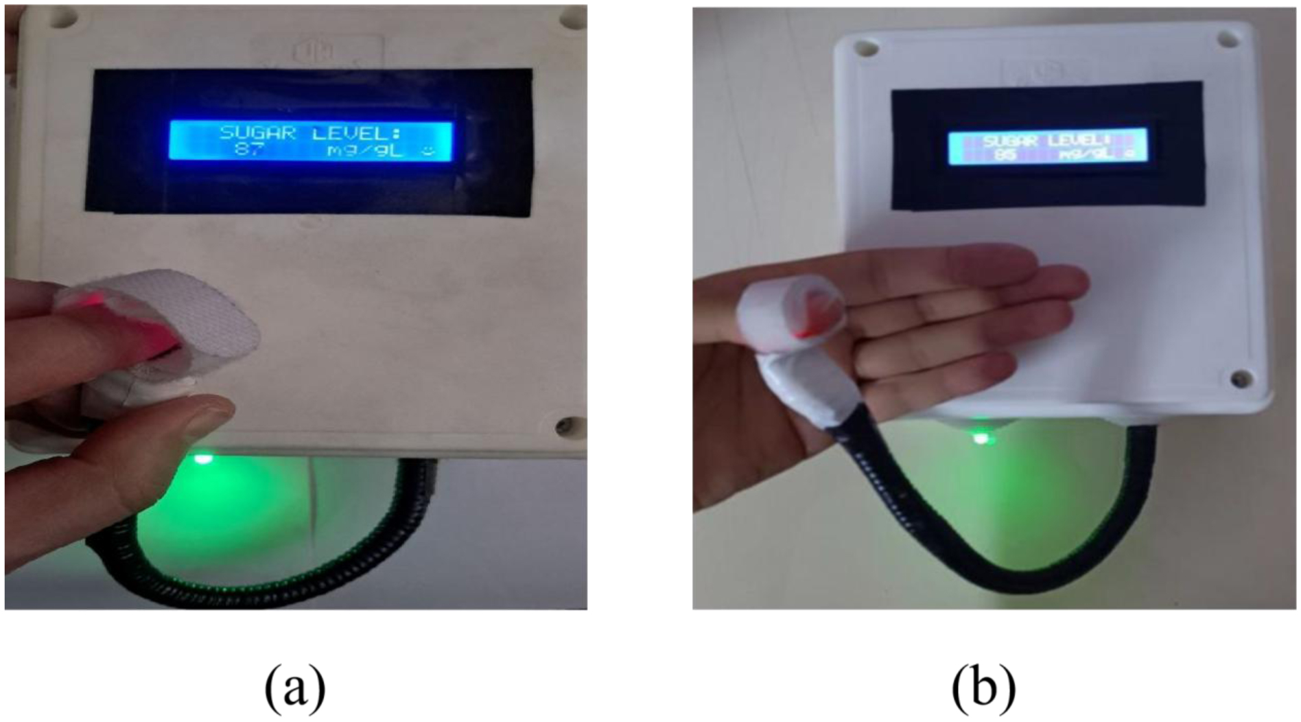 Diabetes is a chronic disorder that is among the most prevalent diseases in many parts of the world, as it is brought about by high levels of sugar in the blood, which may cause severe complications in the heart, blood vessels, kidneys, and nerves. Thus, it is important to monitor blood glucose continuously. The use of traditional finger-prick methods was done away with in this study, and it was substituted with a noninvasive blood glucose meter. The proposed system has an optical sensor known as the MAX30100, an LCD, and an Arduino Mega 2560 microprocessor to provide real-time measurements. The device can determine the glucose content through a combination of digital filtering and mathematical computations implemented within the microcontroller through the correlation of heart rate (HR) and oxygen saturation (SpO2). The 120 samples (females and males, fasting, normal, and diabetic) were tested with the system and compared with a commercial reference device (Accu-Chek). There were high accuracy levels of 97.5% agreement, a sensitivity of 97.94%, and a specificity of 95.65%. Strong correlations were found. HR was negatively correlated with SpO₂ (r = −0.936, p < 0.001) and positively correlated with glucose (R2 = 0.860, p < 0.001). The validity and clinical reliability of the system were validated by statistical methods such as the Clarke error grid, Bland–Altman test, and error test. The suggested approach showed promise as a practical and affordable substitute for regular blood glucose monitoring, and it achieved greater accuracy than that in earlier research.