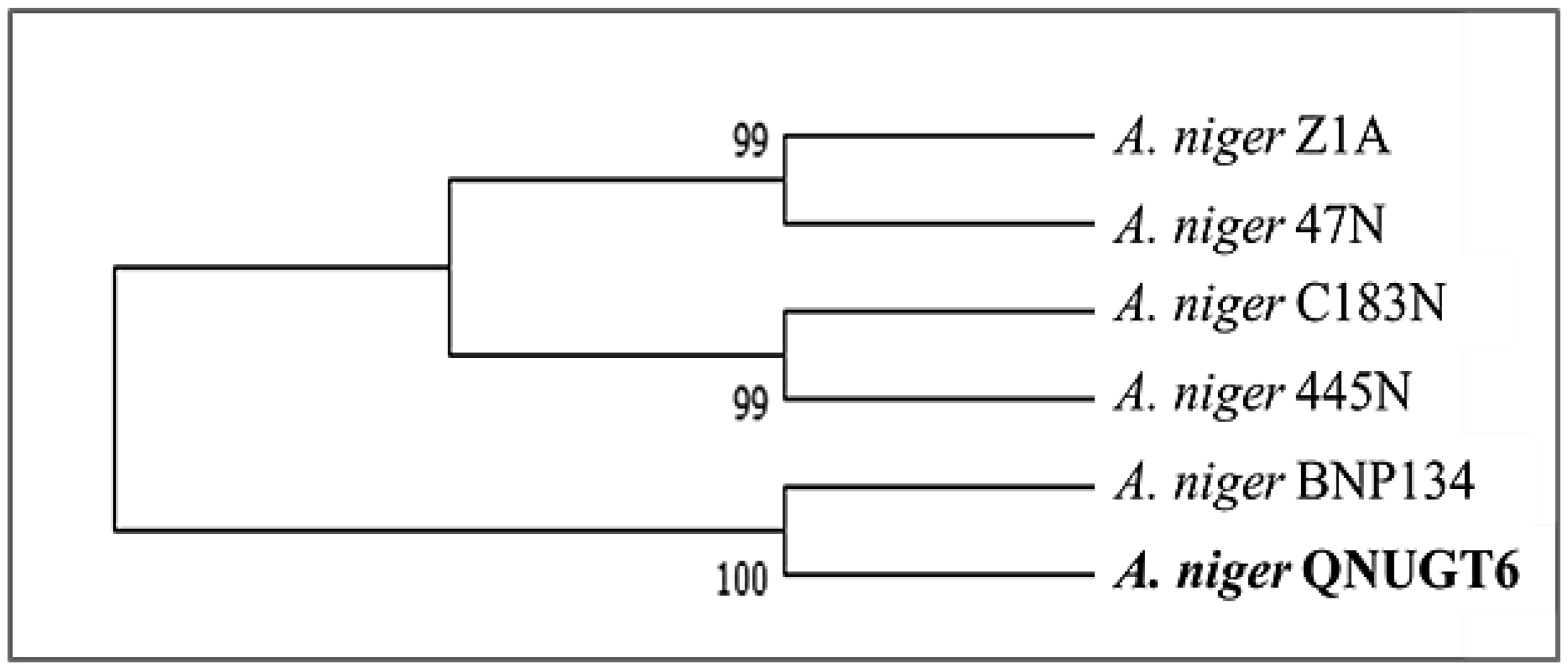 Modern nanotechnology focuses on developing environmentally friendly methods for synthesizing nanomaterials. Among these, the biosynthesis of nanoparticles using biological microorganisms has emerged as a promising strategy. In this study, silver nanoparticles (AgNPs) were synthesized using the extracellular secretions of the fungus Aspergillus niger. The fungal strain was successfully isolated from rice wine yeast and identified as Aspergillus niger QNUGT6 based on morphological characterization and sequencing of the internal transcribed spacer (ITS) gene region. The formation of AgNPs was confirmed by a visible color change and the appearance of a characteristic surface plasmon resonance (SPR) band at 410 nm. X-ray diffraction (XRD) analysis revealed diffraction peaks corresponding to crystalline AgNPs. Fourier-transform infrared (FTIR) spectroscopy indicated the involvement of various functional groups in the culture medium responsible for the reduction of Ag⁺ ions to Ag⁰. Scanning electron microscopy (SEM) analysis confirmed that the synthesized AgNPs were spherical with an average size of 26.1 ± 7.8 nm. Moreover, the synthesized AgNPs exhibited inhibitory activity against Bacillus cereus bacterial pathogens. Thus, our study provides further evidence for the potential use of Aspergillus fungi to control the properties of AgNPs.