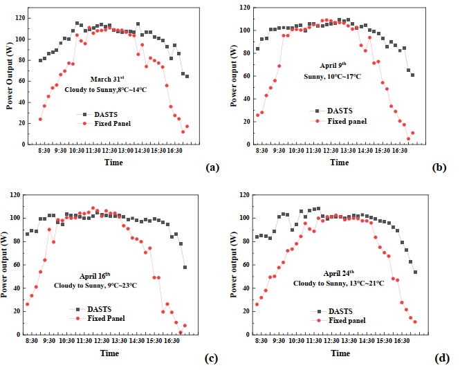 In this work, the enhancement of the solar cell output in a light-dependent resistor (LDR)-based dual-axis solar tracking system (DASTS) in a fixed solar panel system was quantified under different seasons and weather conditions in the city of Qingdao, China. Measurement results show that DASTS could significantly improve power generation efficiency, providing 9.9%–12.8% and 30.6%–32.8% extra daily power output over a fixed-angle system in winter and spring, respectively. It was also found that the power output of the solar panel is higher during the noon period of winter than in spring. Special attention was therefore placed on the effect of panel temperature on the solar panel photovoltaic (PV) conversion efficiency. A clear inverse relationship was observed between the two factors, with the PV conversion efficiency decreasing from 14.7% to 9.8% with an increased panel temperature from 20 to 55 ℃. It is concluded that, to achieve maximum solar cell panel power output, the panel temperature effect needs to be taken into consideration.