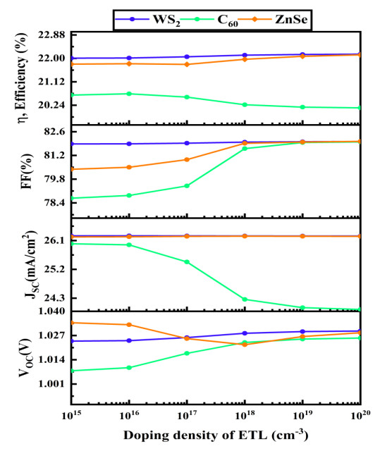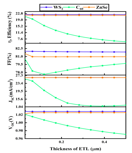 Cesium tin chloride (CsSnCl3) is a potential and ecologically safe material for lead-free perovskite solar cells (PSCs). CsSnCl3 is a strong candidate for sustainable energy applications due to its affordability, high energy efficiency, and excellent thermal stability. We simulated various CsSnCl3 device structures with different electron transport layers (ETLs)—viz. WS2, C60, and ZnSe—in combination with CBTS as the hole-transport layer (HTL), using the one-dimensional solar cell capacitance simulator (SCAPS-1D). We quantitatively evaluated the influence of the absorber layer thickness, doping concentration, defect density, and characteristics of the ETL and HTL on relevant photovoltaic (PV) parameters, such as power conversion efficiency (PCE) (η), short-circuit current density (JSC), open-circuit voltage (VOC), and fill factor (FF). The findings revealed that the choice of ETL has a great impact on the performance of the device. WS2, C60, and ZnSe led to the highest PCEs at 22.09%, 19.94%, and 21.80%. Then, the effect of other factors was investigated, including capacitance-voltage behavior, interface defect, Mott–Schottky behavior, current density-voltage (J-V), quantum efficiency (QE), and recombination rates. The results were compared with the earlier research conducted on CsSnCl3-based PSCs to assess enhancements and long-term sustainability. To summarize, this paper proposes the most effective and high-performance device configurations in lead-free CsSnCl3-based PSCs, as part of developing sustainable and cost-effective PV technologies.