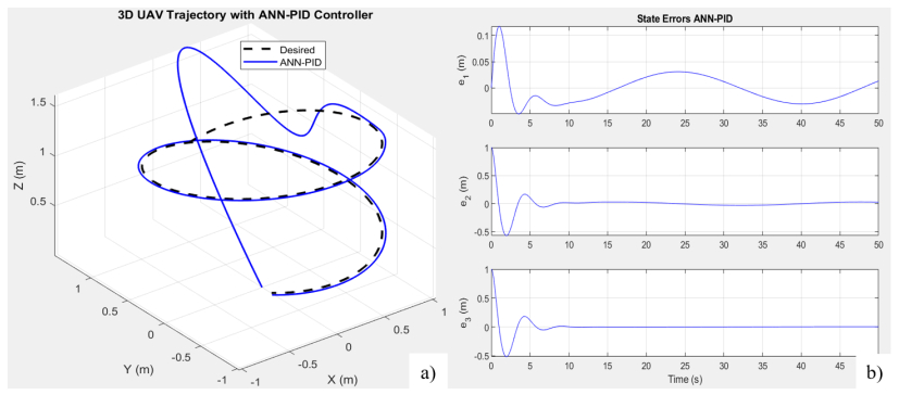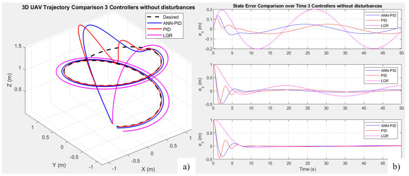 • The development of reliable control systems for unmanned aerial vehicles (UAVs) requires accurate modeling of dynamics and a control architecture capable of handling nonlinearity, external disturbances, and parameter uncertainty. This study addressed that challenge through a comprehensive survey of UAV control strategies, including classical linear controllers (such as PID, LQR, and MPC), advanced nonlinear methods [such as backstepping, sliding mode control (SMC), H-infinity, and active disturbance rejection control (ADRC)], and intelligent control algorithms like fuzzy logic and artificial neural networks (ANN). Based on this, the paper proposed a hybrid ANN-PID controller, where the neural network dynamically adjusts the PID coefficients to enhance adaptability and robustness. The method was evaluated through simulations on the UAV model using Euler–Lagrange dynamics. The quantitative results showed that ANN-PID achieves the lowest steady-state error (0.0229 m), nearly equivalent to PID (0.0230 m) but significantly superior to LQR (0.0807 m, an improvement of about 72%). Regarding rise time, ANN-PID responds quickly (~2.01 s), similar to PID and much faster than LQR (~7.4 s). Although the overshoot of all controllers is high, ANN-PID still achieves a lower value than PID and significantly reduces it compared to LQR under noisy conditions. These results affirm the superiority of the ANN-PID hybrid structure in UAV control, especially in nonlinear and complex dynamic environments.