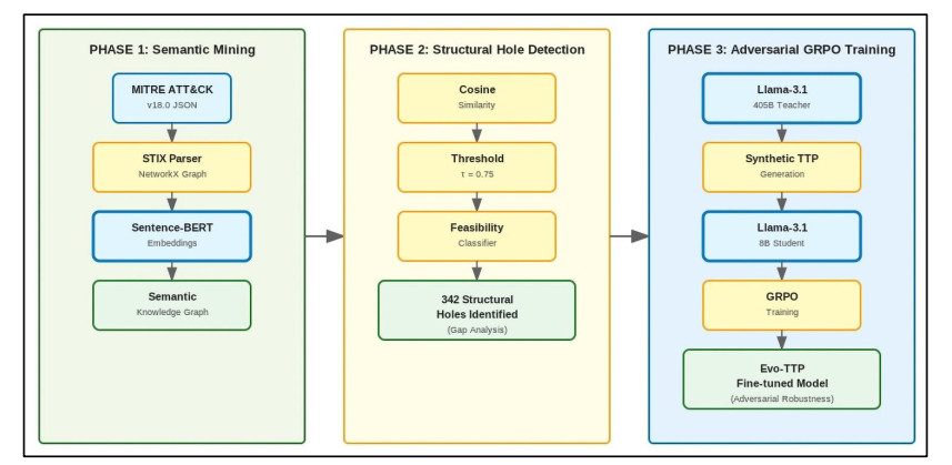 The asymmetrical nature of the modern cyber threat landscape allows advanced persistent threats (APTs) to innovate tactics at a significantly faster rate than defensive frameworks can document them. While the MITRE ATT & CK® framework provides a standardized taxonomy of known behaviors, it essentially functions as a retrospective database — a "dictionary of the past" which fails to anticipate future "zero-day" tactics, techniques, and procedures (TTPs). This paper introduces Evo-TTP, a comprehensive framework for the predictive generation of novel and robust tactics, techniques, and procedures via big data mining and adversarial learning. By leveraging the massive structured data from the MITRE ATT & CK® Enterprise Matrix v18.0, Evo-TTP treats the prediction of future threats as a high-dimensional pattern completion problem. Our methodology addresses two primary failures in current generative AI applications to big data: mode collapse, which refers to hallucinating biologically or technically impossible scenarios, and algorithmic brittleness, which is characterized by its susceptibility to adversarial perturbations. We employ a tripartite approach: (1) applying semantic pattern mining on the v18.0 dataset to create a baseline knowledge graph that reveals hidden correlations; (2) utilizing synthetic novelty expansion with a teacher-student architecture, using Llama-3.1-405B as the teacher and Llama-3.1-8B as the student model, to overcome data scarcity; and (3) conducting training in adversarial group relative policy optimization (GRPO). This training regime maximizes a composite reward function by balancing novelty, technical feasibility, and resilience against adversarial noise. Validated against the 2025 benchmarks and vetted according to SafeGen-X principles, Evo-TTP demonstrates a 23.1% increase in utility and an 18.2% improvement in robustness to adversarial attacks when compared with standard fine-tuning methods. This research positions generative AI not only as a text processor but also as a critical instrument in big data for uncovering the hidden evolutionary mechanics of cyberwarfare.