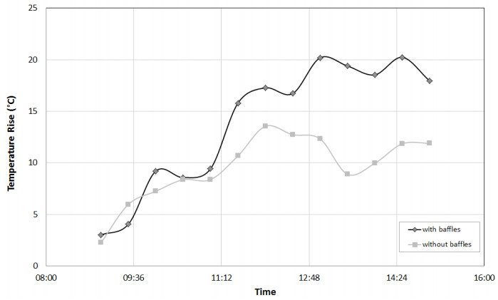 This paper presents a hybrid solar dryer with baffles disposed of on the solar collector. When the levels of solar radiation are low, an electrical heater is used to increase the drying air temperature. A photovoltaic system feeds the electrical heater and the fans, and it is also used to preheat the drying air, increasing the temperature at the inlet of the solar collector. Experimental results of corn drying indicated that the baffles augmented the energy efficiency of the system (from 23.5 to 24.9%) and the temperature rise in the solar collector (from 13.5 to 20.2 ℃), reducing the time required for the corn to reach the final desired moisture content.