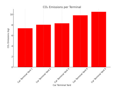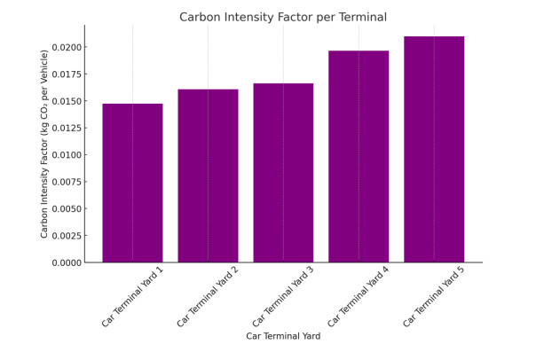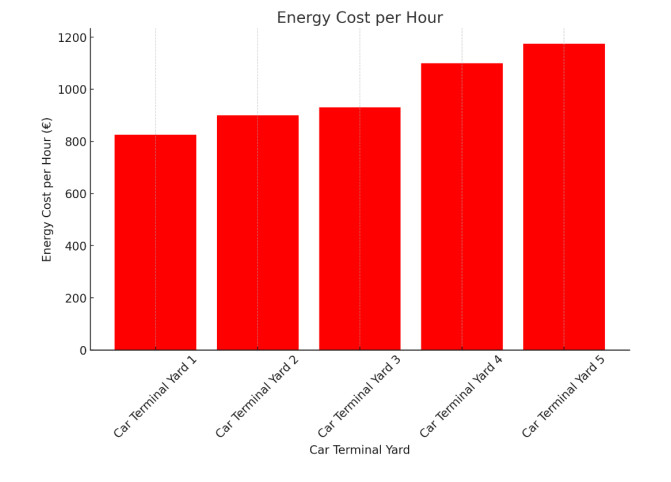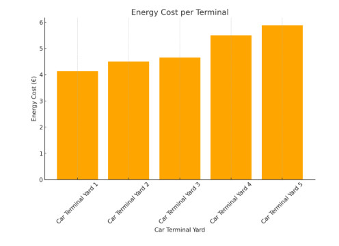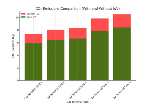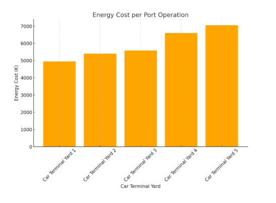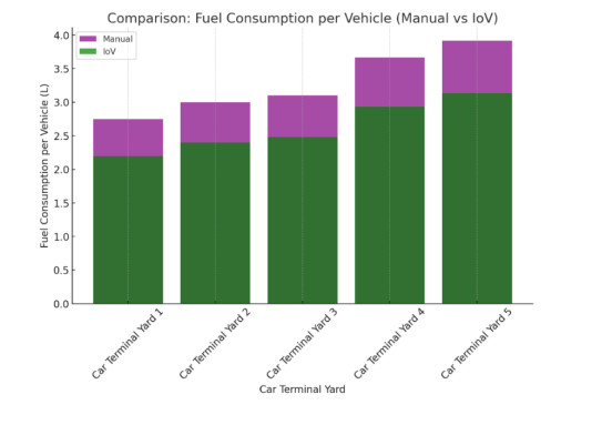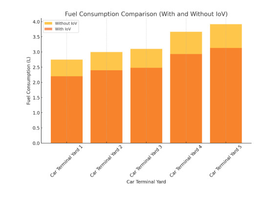 Energy consumption in Roll-on/Roll-off (Ro-Ro) terminals is significantly influenced by the internal movement of vehicles, storage layout, and the frequency of vessel departures. Terminals with European-bound lines generally operate with more regularity and store vehicles near the quay, while those serving non-European destinations must store vehicles in more remote areas, leading to longer displacement times, higher fuel consumption, and increased CO2 emissions. In this study, we present a quantitative evaluation of energy optimization through the implementation of Internet of Vehicles (IoV) in Ro-Ro terminals. By comparing conventional manual operations with an automated IoV-enabled scenario, we analyzed the impact on fuel consumption, energy cost, CO2 emissions, and idle energy loss. Two sustainability indicators (Sustainable Risk Index (SRI) and Carbon Intensity Factor (CIF)) were introduced to assess and compare the environmental performance of different terminal configurations. The findings show that IoV adoption significantly reduces energy consumption and emissions, particularly in terminals with greater internal travel distances. This research offers practical tools for port managers and decision-makers and contributes to the broader discourse on smart energy solutions and digital transformation in port logistics.