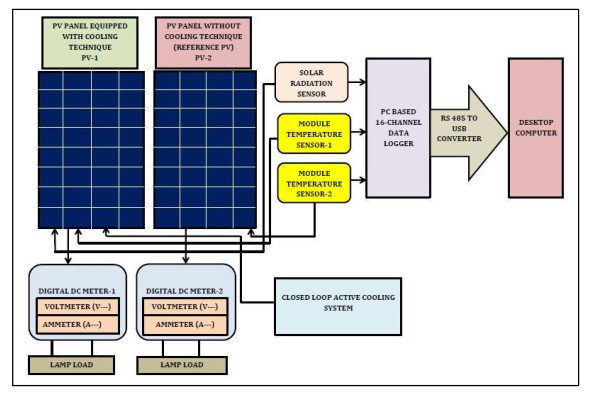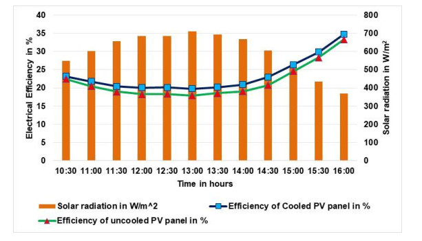 One of the major parameters influencing Photovoltaic (PV) panel's efficiency is temperature. The main problem identified in this study is that high surface temperatures cause PV panels to operate less efficiently and shortens their lifetime. Consequently, a cooling system is needed that diminishes panel temperature and enriches its efficiency. The main objective of the proposed research is to investigate the efficacy of an active cooling system that uses a copper-tube thermal collector integrated with a radiator-style heat exchanger to improve the performance of the PV panel. The city of Kalaburagi in the Indian state of Karnataka was chosen for the experimental testing because of its hot temperature. Our findings showed that the proposed active rear surface cooling system successfully reduced surface temperature by 16 ℃ on average. Cooled and uncooled PV panels had 23.35% and 21.75% average electrical efficiency, respectively. Cooling increased efficiency by 1.6%. The PV system's average thermal efficiency with cooling was 59.6%, and the combined total efficiency reached 82.95%. Thus, our findings presented in this research demonstrate how effective the suggested active back surface cooling was in relation to Kalaburagi city's climate. The research also showed that a closed-loop water circulation system improves PV module performance.