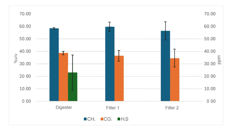In this study, we evaluated the feasibility of water buffalo (Bubalus bubalis) manure as a substrate for biogas production under tropical environmental conditions in southeastern Mexico. The manure was collected from a livestock unit in Chiapas and processed in a 64 m3 lagoon-type anaerobic digester. The substrate was characterized through proximate and elemental analyses, and its chemical formulas and theoretical biogas composition were estimated. Additionally, physicochemical parameters (pH, oxidation-reduction potential (ORP), electrical conductivity (EC), total dissolved solids (TDS), and chemical oxygen demand (COD)) and biogas composition (CH₄, CO2, H2S) were monitored throughout the study. Our results indicated that buffalo manure exhibits favorable properties for anaerobic digestion, with high moisture content (>80%), adequate volatile solids, and adequate carbon and nitrogen contents. Over 14 weeks of operation, the system maintained stable conditions of pH (7.7–8.0) and redox potential (−180 to −280 mV), reflecting an efficient transition toward the methanogenic phase. COD removal efficiency reached 86.6%, with a degradation constant of k = 0.147 week−1. The biogas produced showed a stable CH₄ content (58–60% v/v) and low H2S concentrations (<22 ppm), which were eliminated after filtration, achieving calorific values up to 25.51 MJ/m3, highlighting its potential contribution to decentralized renewable energy systems in tropical rural regions.