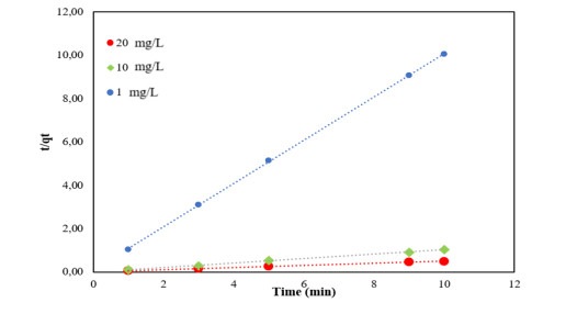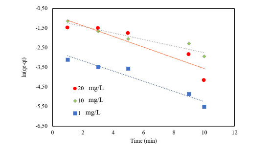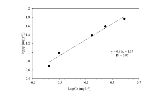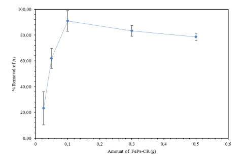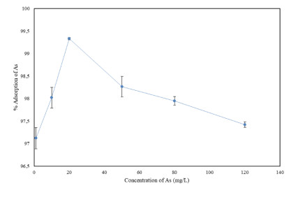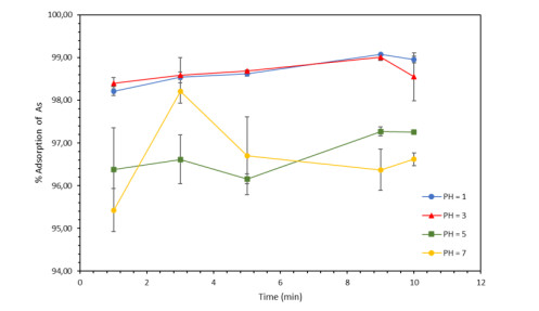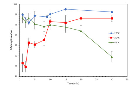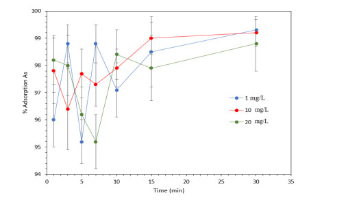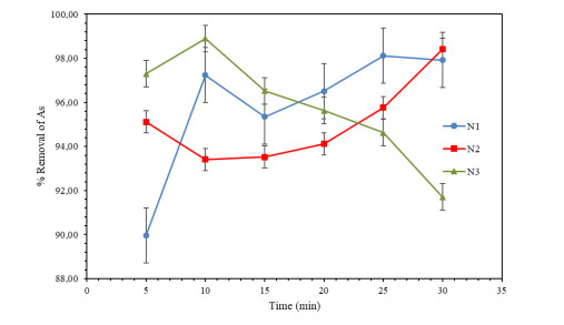 Water pollution represents a critical global challenge affecting human health and natural ecosystems. Among the most hazardous contaminants are heavy metals, particularly arsenic (As), which is frequently detected at elevated concentrations in water bodies as a consequence of anthropogenic activities such as agriculture, mining, and metallurgical processes. In this study, magnetic iron oxide nanoparticles synthesized via a green route using tangerine (Citrus reticulata) peel extract (FeNPs-CR) were developed and evaluated for As removal from aqueous solutions. The nanoparticles were synthesized through a coprecipitation method employing 75 g of pulverized peel extract and characterized by scanning electron microscopy (SEM), FT-IR spectroscopy, UV–Vis spectroscopy, and dynamic light scattering (DLS). SEM analysis revealed quasi-spherical particles with primary sizes ranging from 70 to 300 nm, while DLS measurements indicated larger hydrodynamic diameters due to particle agglomeration in aqueous media. Adsorption experiments were conducted using hydride generation atomic absorption spectroscopy, evaluating the effects of contact time, adsorbent dosage, pH, temperature, and initial As concentration. Removal efficiencies exceeding 99% were achieved at 20 mg/L As within 10–30 min, while concentrations of 50–120 mg/L showed removal efficiencies above 95%. Adsorption kinetics were best described by the pseudo-second-order model, indicating a physicochemical adsorption mechanism. Equilibrium data were better fitted by the Freundlich isotherm (R² = 0.97), suggesting heterogeneous multilayer adsorption, with a maximum adsorption capacity (qmax) of 227.27 mg/g. Thermodynamic analysis revealed negative Gibbs free energy (ΔG° = −7.66 to −11.14 kJ/mol), confirming the spontaneous and exothermic nature of the adsorption process. Optimal performance was observed under acidic conditions (pH 1–3) and temperatures below 35 ℃. These findings demonstrated that FeNPs-CR synthesized from citrus waste constitute an efficient, sustainable, and low-cost adsorbent for As removal, with promising potential for large-scale water treatment applications.
