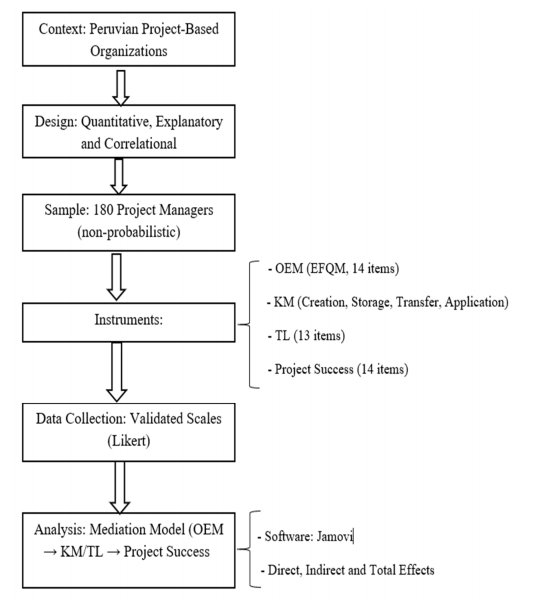 In this research, we examined the mediating role of Knowledge Management (KM) and Transformational Leadership (TL) in the relationship between Organizational Excellence Management (MOE) and Project Success (PS) among 180Peruvian project managers in the service, manufacturing, construction, and technology sectors. A quantitative, explanatory, cross-sectional design using structural equation modeling was applied. The results revealed that OME had a significant direct effect on PS (β = 0.85, p < 0.001) and indirect effects through KM (β = 0.28, p < 0.001) and TL (β = 0.23, p < 0.001). The model explained 60% of the variance in PM, 23% in KM, and 44% in TL, indicating a satisfactory level of explanatory power and model fit. These findings demonstrated that excellence-oriented management practices strengthen knowledge and leadership capabilities, which in turn improve project performance. The study provides empirical evidence supporting the integration of OME, KM, and TL as key drivers of project success in emerging economy contexts such as Peru.