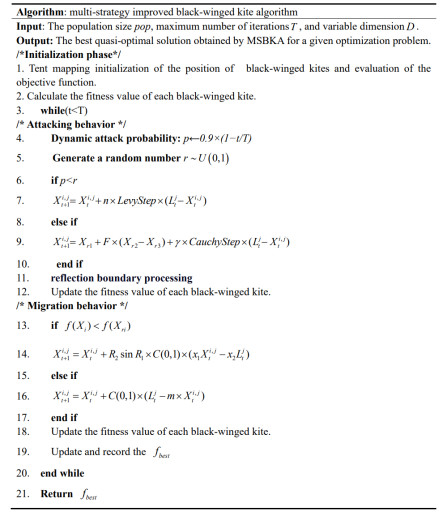 The black-winged kite algorithm (BKA) draws inspiration from the predatory behavior of black-winged kite population. To address its shortcomings, including insufficient exploitation capability, declining population diversity, and susceptibility to local optima, a multi-strategy improved black-winged kite algorithm (MSBKA) is proposed. First, chaotic mapping is introduced in the initialization phase to generate sequences that broadly cover the solution space. Second, a dynamic probability mechanism is employed during the exploitation phase to enhance population diversity and prevent premature convergence. MSBKA incorporates Lévy flight to expand global search capabilities, utilizes differential mutation to strengthen local exploitation, and adopts a reflection boundary-handling strategy to resolve boundary violation issues. Furthermore, the golden sine strategy is integrated, which offers significant advantages in accelerating convergence and avoiding local optima. The algorithm is evaluated on 12 benchmark functions, demonstrating that it achieves a better balance among convergence, robustness, and global search capability. Finally, its applications to engineering problems validate the practical utility of the proposed method.
