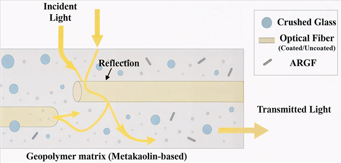 In this study, a new translucent geopolymer concrete (TGPC) was developed using recycled crushed glass as a partial fine aggregate substitute and metakaolin as the only binder to combine sustainability with architectural functionality. This paper presents an eco-innovative system that simultaneously optimizes the structural, optical, and thermal properties, in contrast to traditional translucent concrete that uses Portland cement and virgin optical fibers. Alkali-resistant glass fibers (ARGF), coated and uncoated optical glass fibers (OGF), and crushed glass (0–60%) were included in different amounts in the six mix designs. Extensive tests were performed, including scanning electron microscopy (SEM) microstructural analysis, light transmittance, thermal conductivity, compressive strength, and flexural strength. The optimum proportion (T3), based on the data obtained, reached a unique synergy between strength, transparency, and thermal insulation with a compressive strength of 35.8 MPa, bending strength of 5.0 MPa, light transmission of 2.2%, and lower thermal conductivity of 0.686 W/m·K. Based on the SEM analysis, early interface degradation was noted on the uncoated fibers, but the fluoropolymer-coated OGF retained robust fiber-to-matrix adhesions. This work is original in the context of the first study that employed a unique combination of recycled glass materials, fluoropolymer-coated fibers, and a metakaolin binder with lower carbon emissions. These data show that TGPC is an alternative material suitable for ecologically concerned and energy-efficient daylighting architectural technologies.