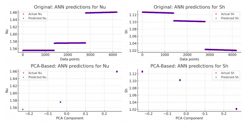 The artificial neural network (ANN) in conjunction with the incompressible smoothed particle hydrodynamics (ISPH) approach, deals with exothermic reaction effects on Cattaneo-Christov (Ca-Ch) heat and mass transport of nano-enhanced phase change material (NEPCM) in a curvilinear cavity. The ANN model, trained on data obtained from ISPH simulations, accurately predicted the mean $ \overline{Nu} $ and $ \overline{Sh} $ values. Two cases of boundary conditions included $ \left({T}_{h}\&{C}_{h}\right) $ on top/bottom walls and $ \left({T}_{c}\&{C}_{c}\right) $ on vertical walls and inner ellipse for C1. The boundary walls of a curvilinear cavity were kept at $ \left({T}_{h}\&{C}_{h}\right) $ and the inner ellipse was maintained at $ \left({T}_{c}\&{C}_{c}\right) $ for C2. The pertinent parameters were scaled as Frank-Kamenetskii number $ Fk\left(0-1, \right) $ Ca–Ch heat, mass transfer parameters $ \left({\delta }_{\theta }\&{\delta }_{\mathrm{\Phi }}\right)(0-0.2), $ Hartmann number $ Ha(0-60), $ buoyancy ratio parameter $ N(-2-4) $, power law index parameter $ n(1.1-1.4) $, Rayleigh number $ Ra({10}^{3}-{10}^{5}) $, Soret/Dufour numbers $ \left(Sr\&Du\right)(0-0.5) $, and fusion temperature $ {\theta }_{f}(0.1-0.9) $. The simulation results demonstrated the effectiveness of Ca-Ch heat and mass transport parameters in lowering temperature and concentration within a curvilinear cavity at C1 and C2. Increasing $ {\delta }_{\theta }\&{\delta }_{\mathrm{\Phi }} $ from 0 to 0.2 resulted in a $ 44.1\% $ and $ 48.9\% $ drop in velocity field at C1 and C2, respectively. Boundary conditions (C1 and C2) significantly affected mass, heat transfer, heat capacity ratio, and velocity field within a curvilinear cavity. An increase in Power law index $ n $ from 1.1 to 1.4, reduced a velocity field by $ 64.68\% $ and $ 64.66\% $ at C1 and C2, respectively. Increasing $ Sr $ and $ Du $ helped distribute concentration. When $ Sr $ and $ Du $ were raised from 0 to 0.5, the velocity field increased by $ 34.17\% $ and $ 29.73\% $, respectively, at C1 and C2.