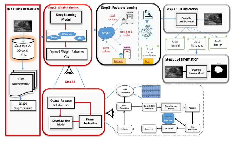 Breast cancer is still one of the leading causes of death in women, and finding it early is essential for treatment to work. This study presents a sizeable deep learning architecture for classifying and segmenting breast ultrasound images. It utilizes federated learning to maintain patients' data privacy. The proposed pipeline begins with a thorough preprocessing stage that includes scaling, normalizing, and advanced image augmentation using affine and contrast-based changes. We employ four convolutional neural network architectures for hierarchical classification: ResNet50, EfficientNet, VGG16, and Xception. First, we distinguish between typical cases and abnormal ones. We then further classify abnormal images into benign and malignant classes. We employ an ensemble technique that combines the outputs of ResNet50 and EfficientNet through a weighted average optimized by a genetic algorithm to enhance the model's resilience. This method dramatically improves the classification's effectiveness, achieving higher accuracy and reliability. We use a federated learning system with the federated averaging (FedAvg) algorithm to improve data privacy. Our federated architecture maintains high accuracy while ensuring that the raw data stays at its local source. We test it with both single-client and multi-client setups. Ultimately, we employ a hybrid architecture that combines the feature maps of ResNet50 and EfficientNet to segment images of lesions known to be malignant. This yields significant spatial agreement with expert annotations. The Dice score and intersection over union (IoU) are two evaluation criteria that demonstrate the effectiveness of our segmentation model. This all-in-one system offers accurate and privacy-conscious breast ultrasound analysis, indicating that it could be beneficial in decentralized healthcare settings. The suggested method was tested using a standard breast magnetic resonance imaging (MRI) dataset, demonstrating its robustness and applicability in various situations. We used the accuracy, precision, recall, and F1-score to measure performance, and we found that the classification was accurate up to 96%. This paper discusses a scalable system that maintains people's privacy by utilizing ensemble learning, optimization-driven feature selection, and federated learning to aid doctors in early breast cancer detection using MRI data. This will make it easier for doctors to use this system in a broader range of medical tests.