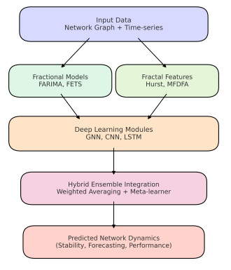 The increasing complexity of modern networks, from communication infrastructures to power grids and social networks, demands models that capture both structural dependencies and nonlinear dynamics of long memory. We proposed a hybrid framework that unified deep learning (graph neural networks, recurrent/attention modules) with fractional calculus to model nonlocal memory, anomalous diffusion, and self-similarity. Fractional differential formulations provide a principled description of network evolution, for which we stated a checkable stability condition; the learning pipeline coupled gradient-based training with fractional operators for robust, interpretable prediction. On Los Angeles metropolitan area traffic (METR-LA) dataset, the proposed ensemble integrated deep fractional model (EIDFM) achieved mean absolute error (MAE) around 6.4 and root mean square error (RMSE) 10.8, which showed improvement over the strongest baseline hybrid (CNN-LSTM): MAE $ 7.8 $, RMSE $ 12.5 $) by 18% and 14%, respectively; mean absolute percentage error (MAPE) droped from $ 6.3\% $ to $ 5.2\% $ ($ \approx17\% $ relative), while $ R^2 $ rose from $ 0.91 $ to $ 0.94 $. Results were reported as mean$ \pm $std over five seeds with paired significance tests. A lightweight efficiency analysis showed modest overhead relative to the baseline (inference $ 3.2\pm0.3 $ ms/step vs. $ 2.8\pm0.2 $; parameters $ 12.8 $M vs. $ 11.3 $M), justified by the accuracy gains. These findings indicated that integrating fractional operators with graph-based deep learners yielded a mathematically grounded and practically effective paradigm for understanding and managing complex network dynamics.