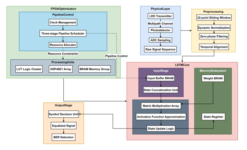 In this study, I proposed a post-equalization method for high-speed visible light communication (VLC) systems using an improved long short-term memory (LSTM) model jointly optimized with a field-programmable gate array (FPGA) to address nonlinear distortion, multipath interference, and model deployment complexity. The LSTM structure was simplified by merging three gates into two and compressing the hidden state to 64 dimensions, while 8-bit fixed-point quantization reduced computational cost. The received signal was divided into a 32-point sliding buffer and aligned in zero phase for precise temporal-symbol matching. The computational graph was modularized into matrix operations, activation, and state update stages, each implemented as dedicated FPGA modules in a three-stage pipeline on an Artix-7 platform. Through loop unrolling and resource sharing, the design achieved a 16-cycle inference latency at 100 MHz with minimal logic utilization. Experimental results demonstrated superior performance, with symbol error rate (SER) ≤ 0.0031 and normalized mean square error (NMSE) ≤ 0.0115 across LED drive currents. Under 8-PAM modulation, total harmonic distortion (THD) and error vector magnitude (EVM) were maintained at 3.45% and 4.32%, respectively, showing enhanced nonlinear tolerance and equalization stability. As the multipath delay spread increased from 5 ns to 25 ns, the average intersymbol interference ratio (ISI-Ratio) improved from 20.7 dB to 28.4 dB, and the dynamic timing error (DTE) remained within 1.82 × 10-3–3.14 × 10-3. The lookup table (LUT) usage was kept within 78.2% ± 0.9%, and the inference latency was (0.160 ms ± 0.003 ms). These results indicated that the proposed method effectively mitigates multipath effects and achieves an optimal trade-off between algorithmic compactness and hardware efficiency, providing a closed-loop optimization pathway for intelligent equalization in resource-constrained optical communication systems.
