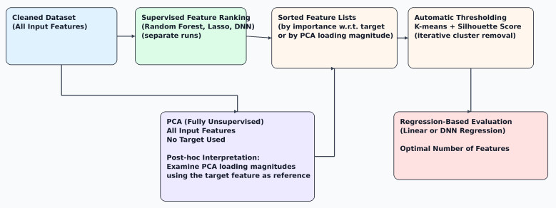Feature selection (FS) in huge data sets is a critical aspect of machine learning that involves choosing the most relevant features. It plays a significant role in improving the model's performance, reducing overfitting, and enhancing the interpretability. In this paper, we construct an automatic modification of the basic FS techniques such as Lasso, Deep Neural Network (DNN), Random Forest (RF) and a Principal Component Analysis (PCA), based on the K-means clustering method and the Silhouette score method, instead of visualization or threshold based methods based on background knowledge. Additionally, the construction of two hybrid methods is proposed, the purpose of which is to exploit the advantages offered by a number of feature seledtion methods: the first is the score method to leverage multiple types of methods; and the second is the refinement method to enhance the outcomes of one method by adapting them to another method. Moreover, to evaluate the efficiency of the FS method, a linear regression and a DNN nonlinear regression are employed to minimize the dependency of the choice of the regression. Through numerical tests, we show that the automatic modification of the conventional methods can generate a convenient way to set the criterion. Additionally, based on the results that are derived from both the linear regression and the DNN regression, the hybrid FS techniques can more accurately perform in both the linear and nonlinear regressions without any dependency on the data.