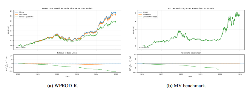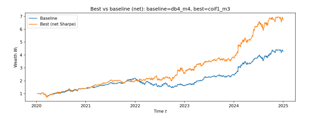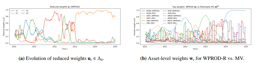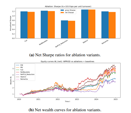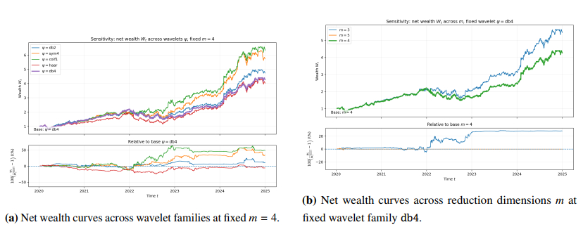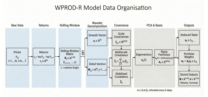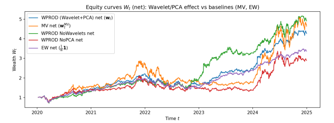 We provided a self-contained formulation and established core properties of the scheme, including positive definiteness and stability of the multiscale covariance updates, stability of the principal component analysis (PCA)–softmax basis under perturbations, simplex invariance of the mirror update, and explicit turnover control that transferred from reduced allocations to traded allocations, including the effect of periodic basis refresh. Empirical experiments were then conducted on real equity data, including transaction costs, compared against equal-weight and classical mean–variance baselines, including sensitivity and ablation analyses. The results illustrated that the multiscale and reduced-order components produced materially different dynamic allocations and contributed to risk-adjusted performance and trading stability. We referred to the proposed method as WPROD-R, a shorthand for a wavelet-driven product (multiplicative mirror-flow) scheme with a reduced-order representation.
