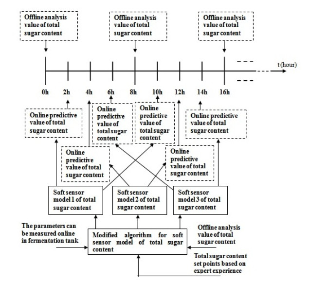 In the process of chlortetracycline (CTC) fermentation, no instrument can be used to measure the total sugar content of the fermentation broth online due to its high viscosity and large amount of impurities, so it is difficult to realize the optimal control of glucose feed rate in the fermentation process. In order to solve this intractable problem, the relationship between on-line measurable parameters and total sugar content (One of the parameters that are difficult to measure online) in fermentation tank is deeply analyzed, and a new soft sensor model of total sugar content in fermentation tank and a new optimal control method of glucose feed rate are proposed in this paper. By selecting measurable variables of fermentation tank, determining different fermentation stages, constructing recursive fuzzy neural network (RFNN) and applying network rolling training method, an online soft sensor model of total sugar content is established. Based on the field multi-batch data, the change trend of the amount of glucose feed required at each fermentation stage is divided, and the online prediction of total sugar content and the optimal control strategy of glucose feed rate are realized by using the inference algorithm of expert experience regulation rules and soft sensor model of total sugar content. The experiment results in the real field demonstrate that the proposed scheme can effectively predict the total sugar content of fermentation broth online, optimize the control of glucose feed rate during fermentation process, reduce production cost and meet the requirements of production technology.