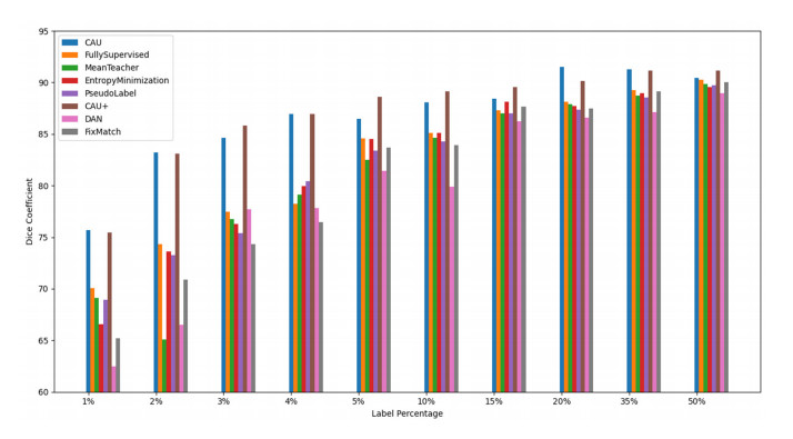 Citation: Wenli Cheng, Jiajia Jiao. An adversarially consensus model of augmented unlabeled data for cardiac image segmentation (CAU+)[J]. Mathematical Biosciences and Engineering, 2023, 20(8): 13521-13541. doi: 10.3934/mbe.2023603