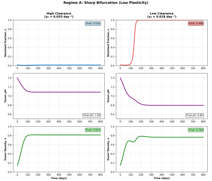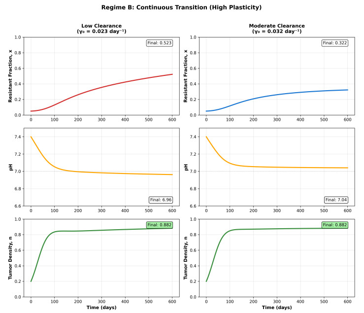 Acidosis in tumors arises from reprogrammed metabolism and compromised vasculature, creating a harsh, acidic microenvironment that drives the evolutionary selection of acid-resistant cell phenotypes. A mathematical model was proposed to integrate phenotypic evolution, microenvironmental acidification, and tumor density dynamics. Three key mechanisms were incorporated in it: frequency-dependent selection favoring acid-resistant cells below a critical pH, stress-induced phenotypic switching, and a positive feedback loop where resistant cells produce excess acid that intensifies selection pressure. The well-posedness of the model was established. Through numerical simulations across biologically relevant parameter regimes, we identified two therapeutically targetable parameters: the baseline acid clearance rate (a proxy for vascular perfusion) and a protection factor (representing acid-resistance "machinery" effectiveness) as critical bifurcation parameters for resistance evolution. The model exhibits qualitatively distinct dynamics depending on phenotypic plasticity levels. In low-plasticity tumors, both parameters exhibit sharp bifurcations with strong parameter interactions: clearance and protection effects are context-dependent, with therapeutic interventions effective only within specific parameter ranges. In high-plasticity tumors, both parameters produce continuous, monotonic responses with independent, additive effects. These regime-dependent dynamics suggest that treatment strategies should adapt to tumor plasticity: in the former, targeting perfusion alone is typically sufficient, though sequential therapy may be required if the perfusion rate approaches or exceeds the bifurcation threshold, whereas in the latter, treatment might benefit from combination therapies addressing both parameters simultaneously. These findings suggest that a low-dimensional model can identify therapeutically targetable parameters governing resistance evolution, suggesting interventions that may prevent or reverse the harmful effect of acid-resistant phenotypes, which are associated with chemotherapy failure, immune evasion, and metastatic progression.