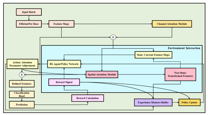 Parkinson's disease (PD) is the second most common neurodegenerative disorder, characterized by the gradual deterioration of dopamine-producing neurons. The main challenge of diagnosing this disease is that physical changes in the brain begin before the patient shows outward symptoms. This leads to the necessity of developing early methods for the detection of this disease. Therefore, with the proposed model, we aimed to significantly improve the early classification of PD using MRI scans by capitalizing on advanced Artificial Intelligence (AI) and Deep Learning (DL) techniques. Our goal of the proposed model was to develop a robust medical decision-support system that enhances the diagnostic precision and supports prompt clinical intervention strategies. The method proposed was a modified EfficientNet DL model combined with the reinforcement learning optimization. This approach enabled a dynamic adjustment of model parameters to effectively minimize the misclassification rates while differentiating MRI scans of PD patients and healthy individuals. Certain performance metrics were used to calculate the performance of the proposed detection model. The results showed that the research achieved high precision, recall, and F1-score values with 98% accuracy for both classes. In the patients (class 0), the precision rate was 95%, the recall rate was 96%, and the F1-score was 98%. Similarly, for healthy individuals (class 1), the precision rate was 93%, the recall rate was 97%, and the F1-Score was 96%. Thus, the proposed EfficientNet model revealed significant enhancements in the diagnostic performance compared to the standard methods. The innovations outlined in this study emphasize the transformative power of AI in enhancing diagnostic predictions. Moreover, the convergence of a DL based EfficientNet model and reinforcement learning based metaheuristic optimization establishes a prospective implementation of predictive analytics in managing high-risk PD with the defined objective of optimizing the patient outcomes within the field of neurology.