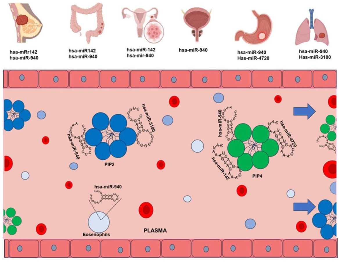 MicroRNAs (miRNAs) are key post-transcriptional regulators of gene expression and have been associated with pathological processes, including oncogenesis. In this study, the interaction between miRNAs and phosphoinositides, particularly phosphatidylinositol 4,5-bisphosphate (PIP2), was explored by pull-down assays, followed by RNA sequencing (RNA-seq) analysis in HeLa cells. Four miRNAs with specific affinity toward PIP2 and PI4P were identified, including hsa-miR-3181-1, hsa-miR-4720, hsa-miR-142, and hsa-miR-940. Structural analysis suggested that the interaction with lipids is mediated by secondary conformations rather than by sequence homology. Furthermore, two of these miRNAs were present in human blood fractions, with particular emphasis on hsa-miR-142, whose plasma distribution suggests a potential role as a phosphoinositide-mediated long-range signaling molecule. These miRNAs have been associated with tumor-related processes, suggesting a potential, although not yet confirmed, relevance as noninvasive biomarkers or therapeutic targets in cancer.