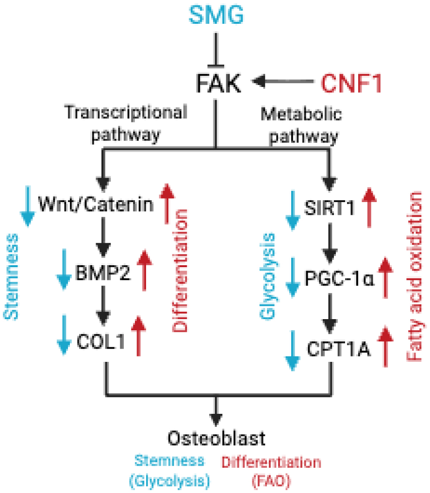 Our results showed that, besides its established inhibition of FAK and the Wnt/β-catenin signaling cascade, SMG also induced a metabolic shift from fatty acid oxidation (FAO) to glycolysis by decreasing mitochondrial content and reducing expression of metabolic regulators [sirtuin-1 (SIRT1), peroxisome proliferator-activated receptor-γ coactivator-1α (PGC-1α), and carnitine palmitoyl transferase-1α (CPT1A)] that are critical for mitochondrial biogenesis and FAO capacity. CNF1 exposure was found to counteract the SMG's inhibitory influence by upregulating expression of above metabolic regulators and restoring mitochondrial content and FAO as the primary cellular metabolism and thereby rescuing OBD. Altogether, our findings emphasize that FAK activation plays a critical role in restoration of SMG-inhibited osteoblast differentiation by triggering transcriptional Wnt/B-Catenin-BMP2 (bone morphogenic protein-2)-COL1 (type-1 collagen) and metabolic SIRT1-PGC1a-CPT1A pathways.