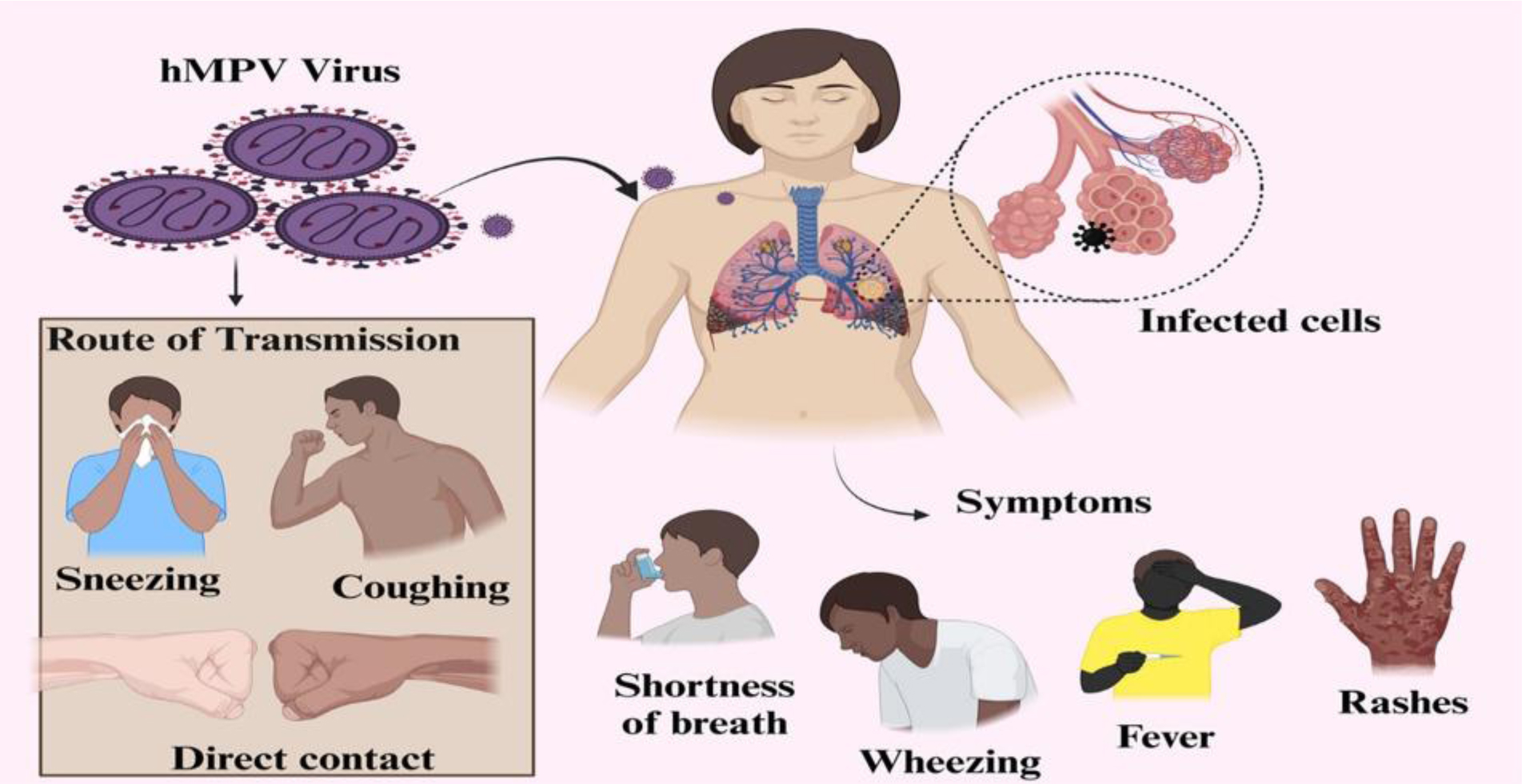 Human metapneumovirus (HMPV) has emerged as a significant global cause of acute respiratory infections, disproportionately affecting vulnerable populations such as young children, the elderly, and immunocompromised individuals. Despite its considerable impact, contributing to 5%–15% of pediatric respiratory hospitalizations and 10% of respiratory deaths in children under five, HMPV often remains underdiagnosed and receives insufficient attention within public health frameworks. The absence of specific antiviral treatments and preventative vaccines further exacerbates its clinical consequences.