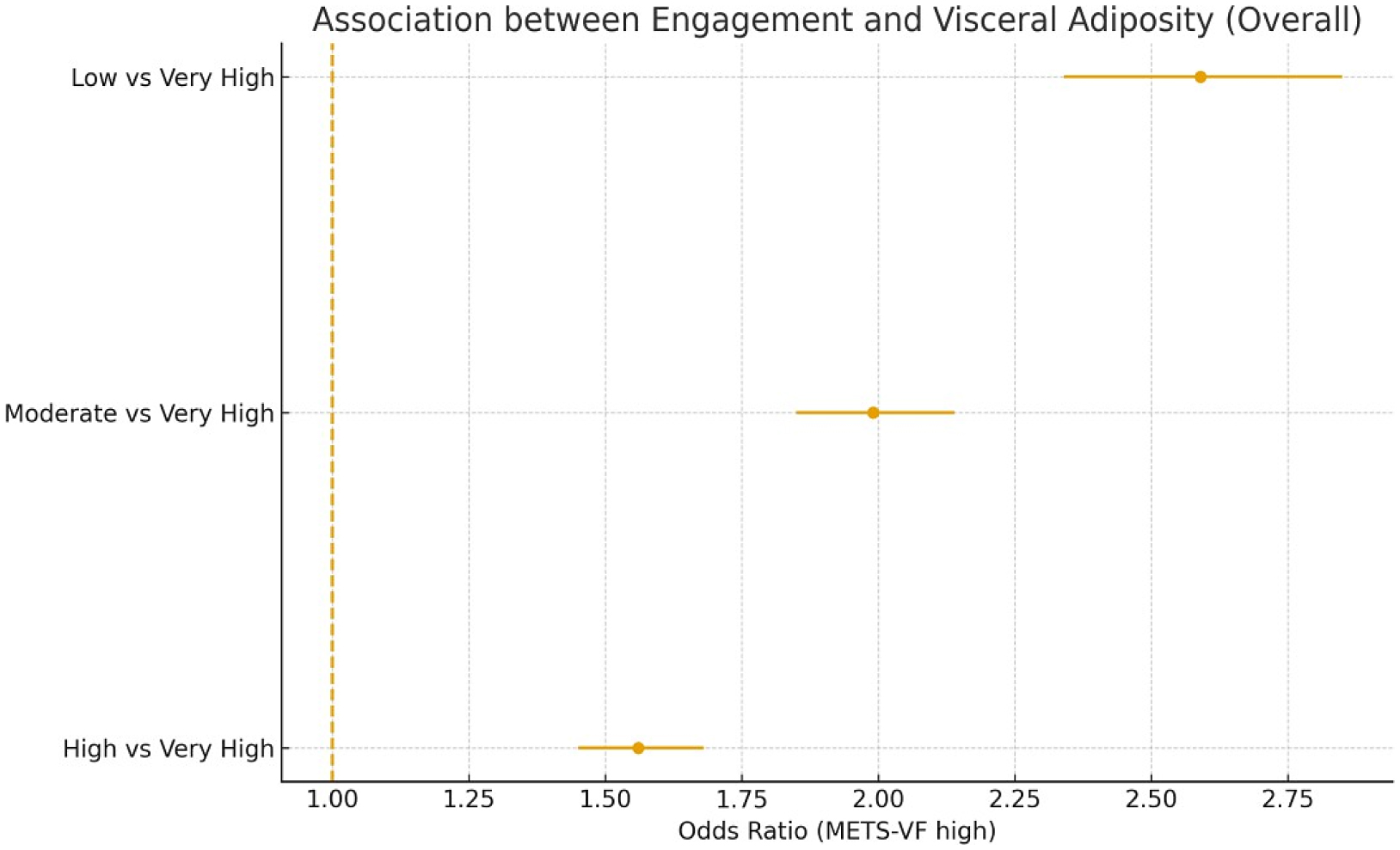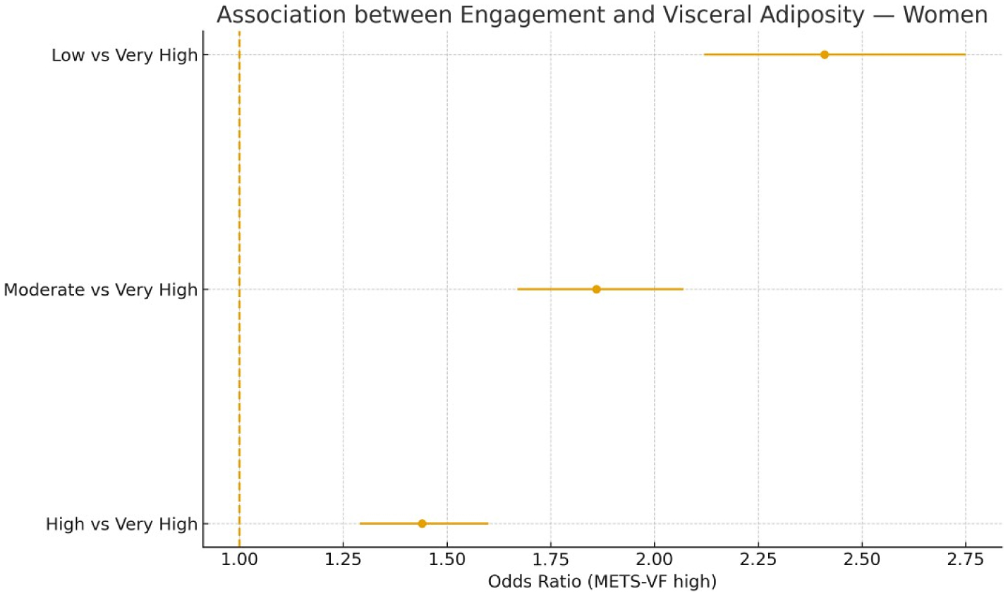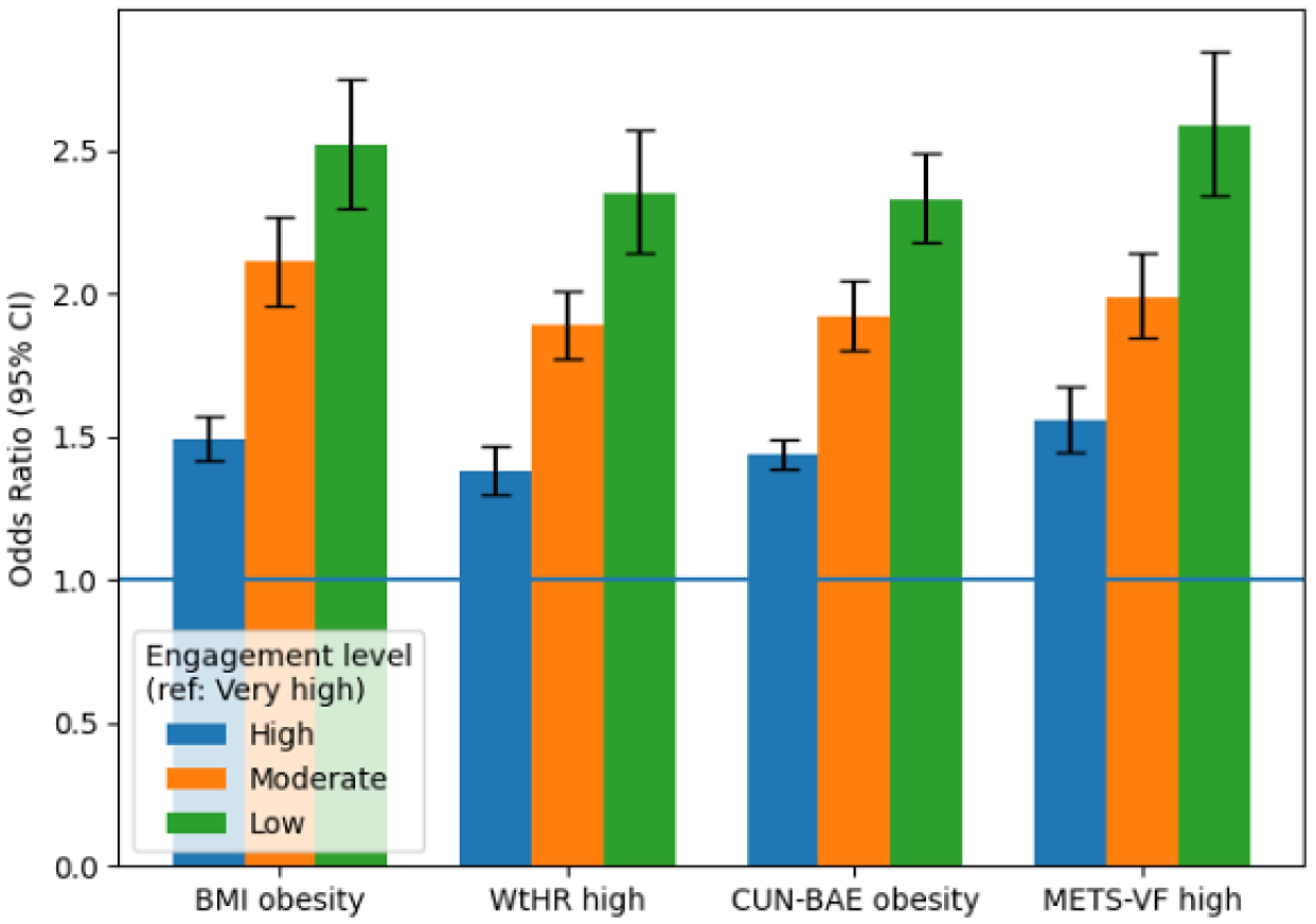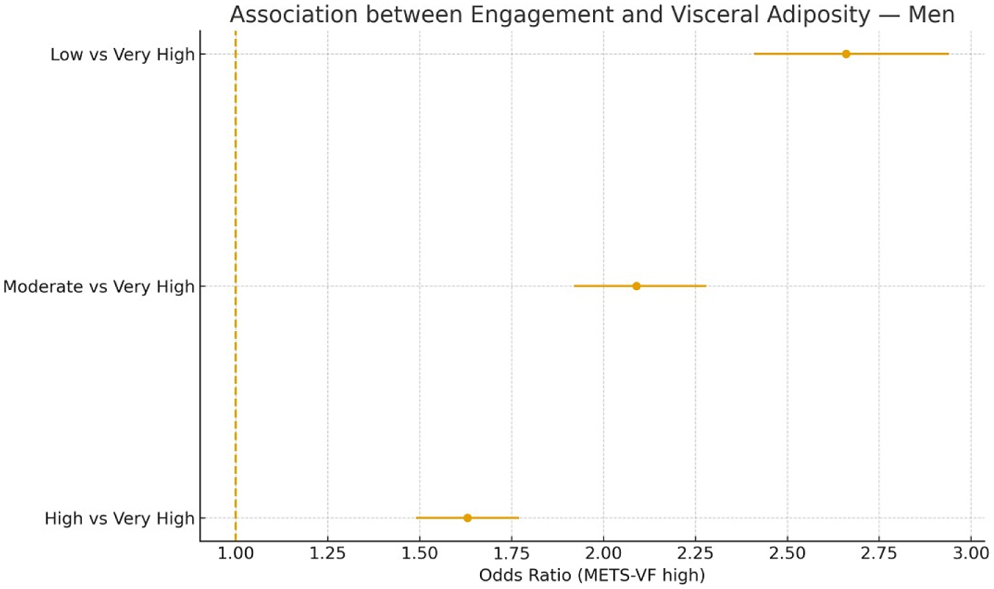 Lower engagement levels were independently associated with higher odds of adiposity across all indices, particularly visceral fat (METS-VF). Participants with low engagement had an adjusted OR = 2.59 (95% CI 2.34–2.85) for high METS-VF compared with those with very high engagement (p-trend < 0.001). Approximately 40% of this association was mediated by lifestyle factors, mainly physical activity. The results remained robust across sensitivity analyses, including nonlinear modeling, imputation, and cluster adjustment.