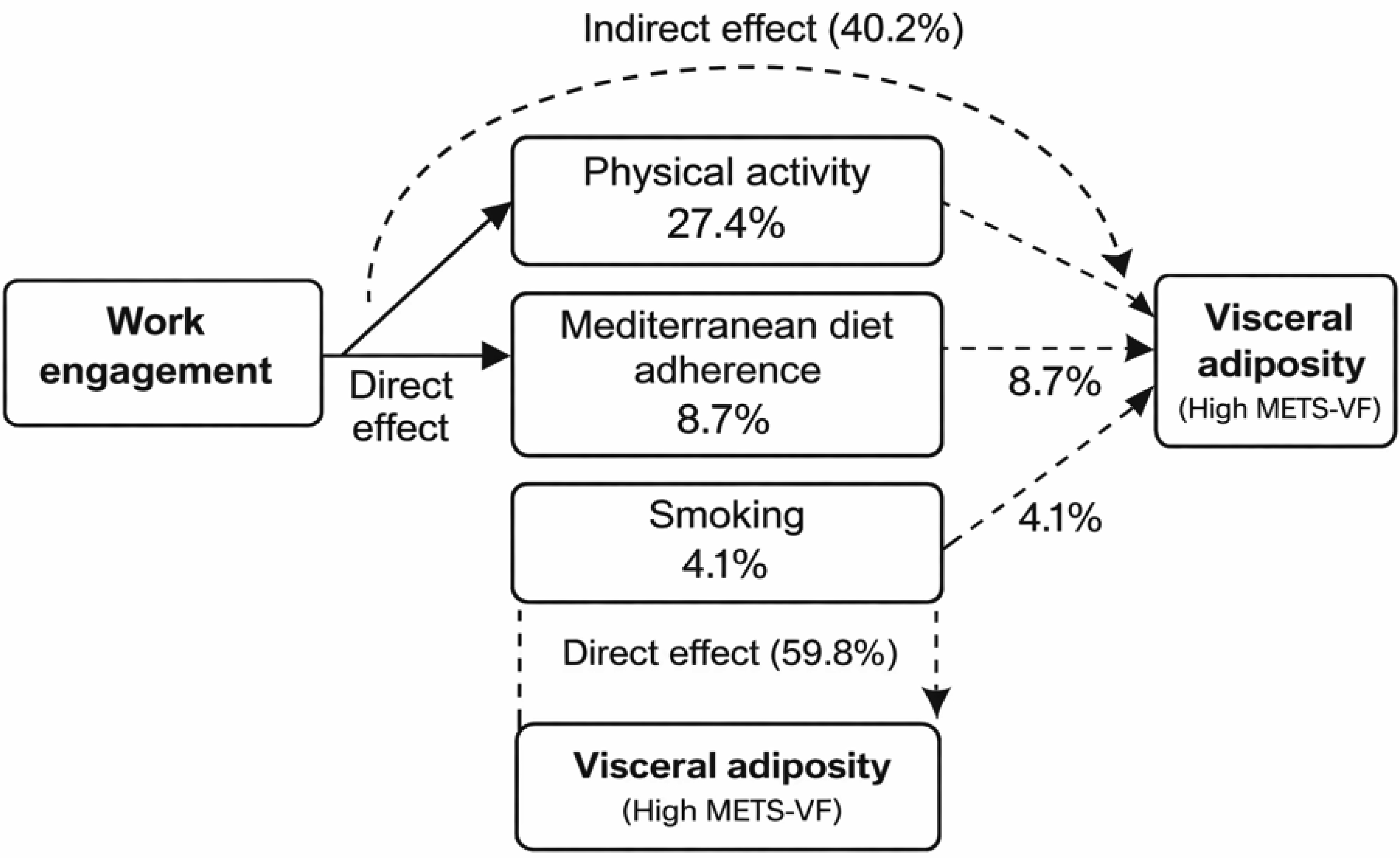 Lower work engagement is strongly associated with increased visceral adiposity among Spanish workers, partly through behavioral mechanisms. Enhancing engagement may represent an effective psychosocial strategy to improve both psychological well-being and metabolic health in occupational settings.
