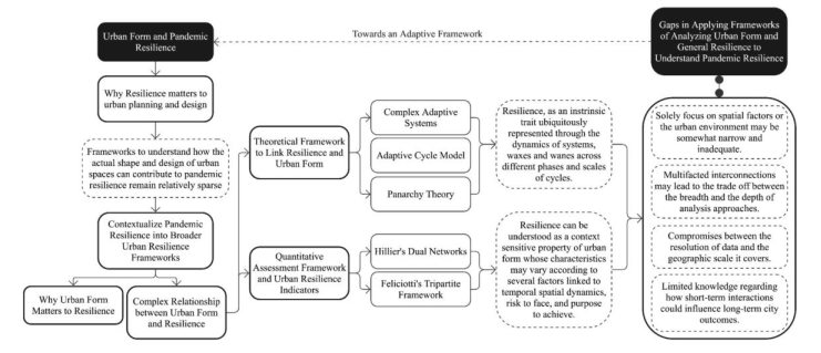 Urbanization is rapidly increasing, with urban populations expected to grow significantly by 2050, particularly in developing regions. This expansion brings challenges related to chronic stresses and acute shocks, such as the COVID-19 pandemic, which has underscored the critical role of urban form in a city's capacity to manage public health crises. Researchers are examining how built form, density, and neighborhood structure shape pandemic outcomes. This work adds to the literature and, rather than offering another empirical case study or city-specific design checklist, it bridges the general resilience/morphometrics frameworks with pandemic-specific discussions. We seek to transfer the knowledge of prevalent resilience theories into the context of a pandemic to better understand the relationship between pandemic resilience and urban morphology. In this work, we emphasized the connection between theoretical ideas with quantitative frameworks, offering a cohesive analysis that traces how concepts such system assets, attributes, and performances can be operationalized through morphometric indicators. We synthesize general urban resilience frameworks and morphometric approaches to explicitly map how their concepts and indicators can be adapted to the assessment of pandemic resilience while engaging with the emerging literature on pandemic urbanism and extended urbanization. Our goal is not only to enhance the understanding of urban resilience but also to offer a multi-scalar conceptual map for future empirical work.