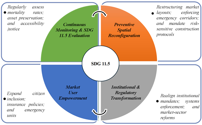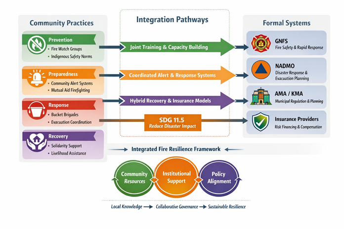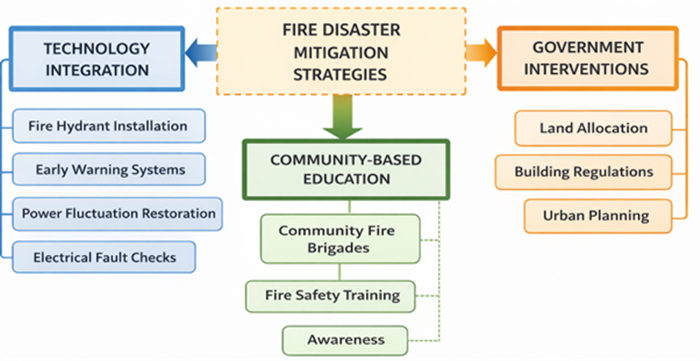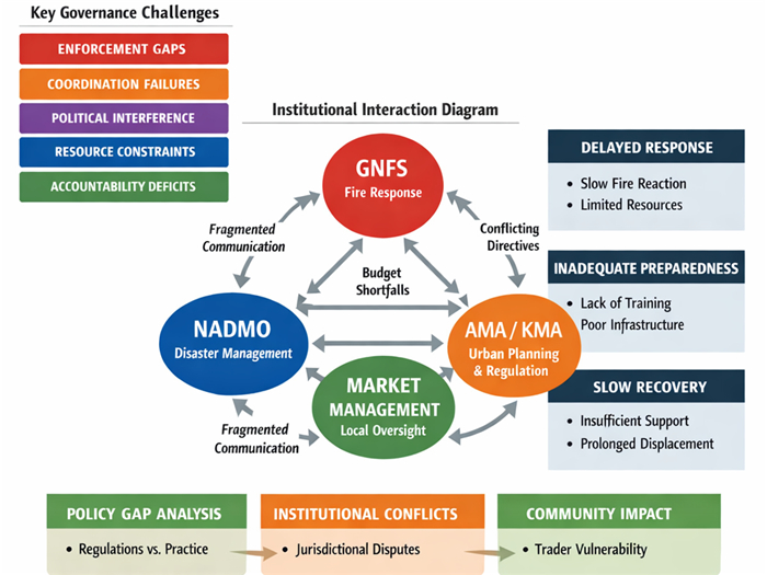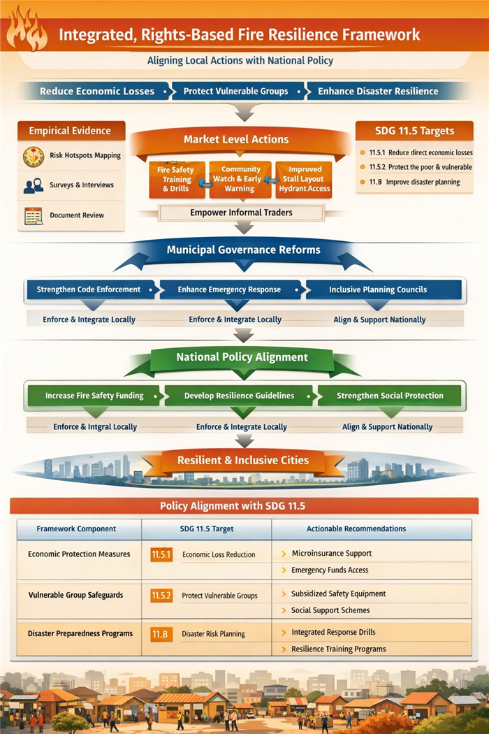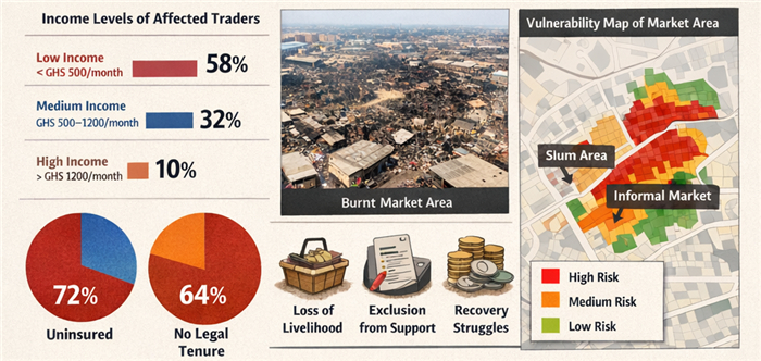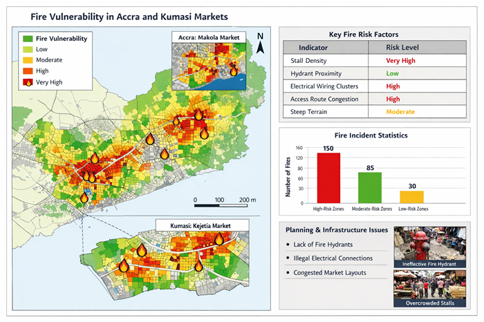 • Fire outbreaks have become a recurrent urban disaster undermining the Right to the City —understood here as the collective right to safe, inclusive, and participatory urban spaces—in Ghana's rapidly urbanising centres. Despite policy commitments to inclusive and sustainable cities, repeated fires in markets and informal settlements revealed persistent structural vulnerabilities and governance breakdowns. This study examined the structural vulnerabilities through which spatial configurations, socio-economic inequalities, and institutional practices perpetuate urban fire risk in Accra and Kumasi. Using a mixed-methods approach combining geospatial analysis, household surveys, key informant interviews, and policy review, the study identified market-level fire risk patterns and traced how inadequate infrastructure, weak regulatory enforcement, and fragmented governance systems translated into heightened exposure and unequal losses. Results demonstrated clear pathways linking poor spatial planning and limited fire safety provision to recurrent fire incidents, particularly among informal traders and low-income households. It further showed that urban fire governance remained largely reactive, with minimal integration of preventive, community-led resilience practices. Grounded in the Right to the City and urban resilience frameworks, the study advanced a context-specific Fire Resilience Framework that integrated spatial planning reform, participatory governance, and low-cost technological support. It concluded that strengthening these structural pathways is critical not only for reducing fire risk, but also for advancing equitable, inclusive, and sustainable urban development in Ghana and comparable Sub-Saharan African contexts.
