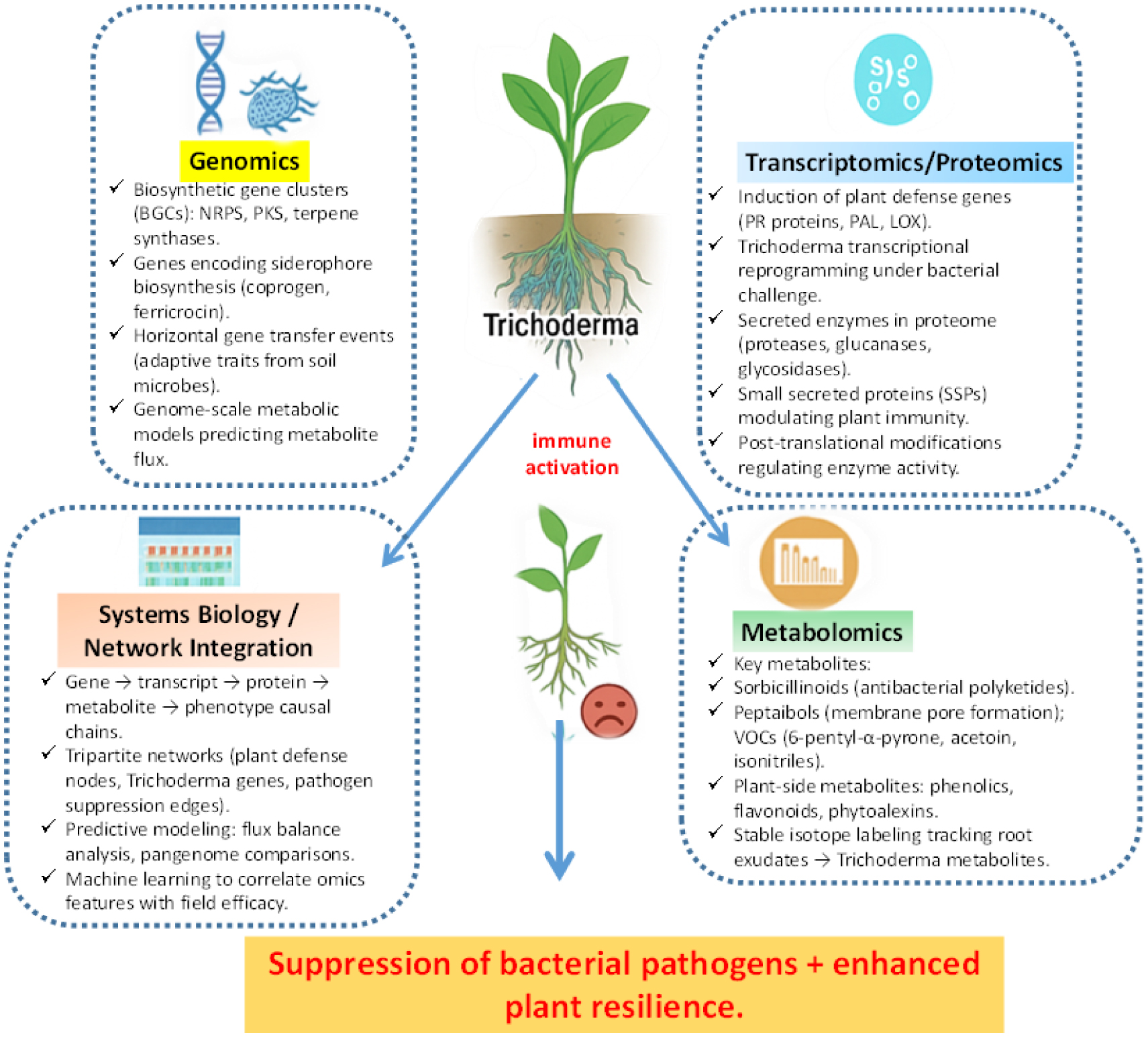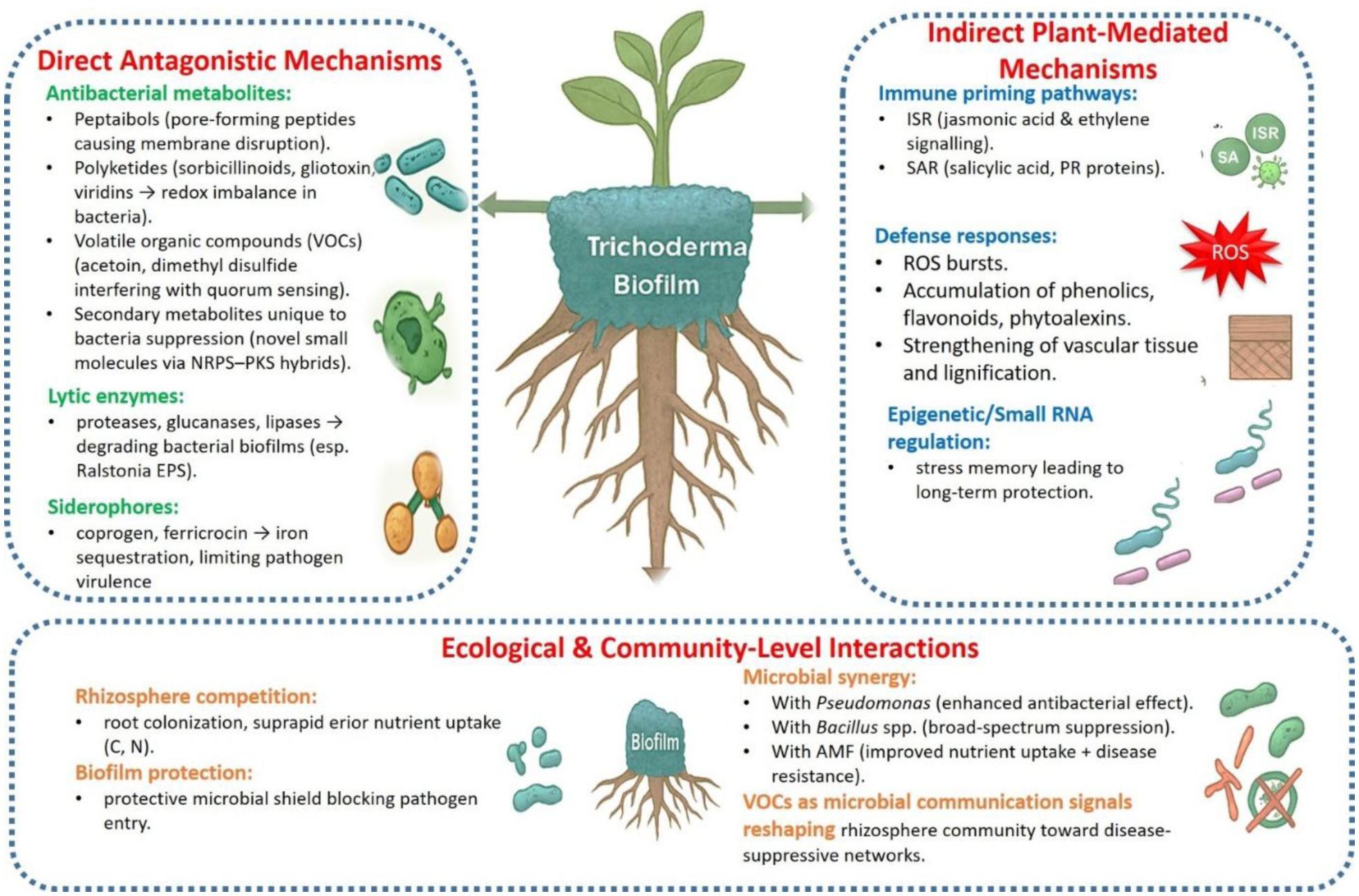 • Bacterial phytopathogens such as Ralstonia, Xanthomonas, and Pectobacterium pose a serious threat to global food security, while overuse of chemical pesticides has led to resistance and environmental concerns. Trichoderma, traditionally known for antifungal activity, is emerging as a versatile antagonist of bacterial diseases through antibacterial metabolites, immune response, nutrient competition, and rhizosphere modulation. Multi-omics advances have revealed novel biosynthetic gene clusters and host interaction mechanisms, while CRISPR-based genome editing and synthetic biology approaches are enabling the tailored strains with enhanced biocontrol efficiency. Nanotechnology further contributes by facilitating nanoparticle-mediated biosynthesis and controlled-release formulations, improving stability and targeted field delivery. Despite remaining challenges related to field translation, biosafety, and regulation, the integration of omics, genetic engineering, and nanotechnology establishes Trichoderma as a next-generation platform for sustainable and precision crop protection.