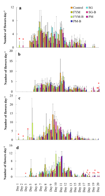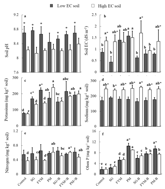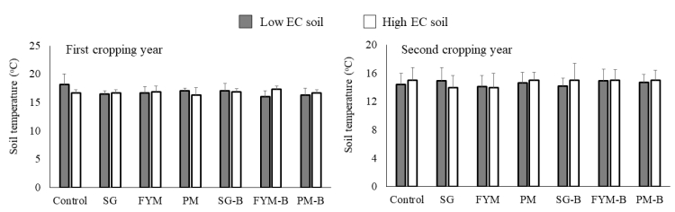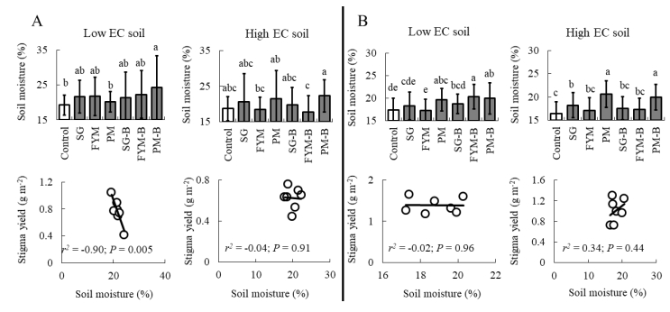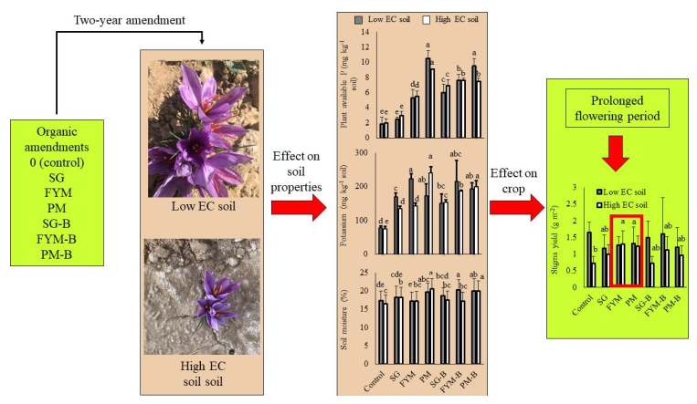 A two-year field study was conducted in soils with low and high electrical conductivity (EC): 0.25 dS m–1, and 1.95 dS m–1 respectively). The high EC soil was transported from agricultural land. Composted manures obtained from sheep/goat (SG), dairy (FYM), and poultry (PM) farms and manures co-composted with biochar made from Acacia nilotica L. wood (SG-B, FYM-B, and PM-B) were added to the soil for two consecutive years. The influence of these organic fertilizers on soil properties, flowering period, and fresh yield of saffron (Crocus sativus L.) stigma was examined. Analysis of soil collected after the harvest of the second-year crop revealed that organic fertilizers caused a significant two- to fourfold increase in the concentration of potassium and bioavailable phosphorus in both low EC soil and high EC soil. After two years of cropping, the EC of high EC soil dropped to 0.94 to 1.71 dS m–1 under various treatments. In the low EC soil, FYM-B triggered 2–3 days of early flowering in both cropping years. However, this prolonged flowering period did not cause any increase in stigma yield. Furthermore, in this soil, for the first-year crop, all organic fertilizers reduced stigma yield by 41–44% compared with control treatment, whereas no difference among treatments was observed for the second-year crop. The stigma yield in the high EC control soil was significantly lower than in the low EC control soil by 26% and 56% for the first- and second-year crops, respectively. In high EC soil, no difference among treatments was observed in the stigma yield of the first-year crop. However, for the second-year crop in the high EC soil, all organic fertilizers prolonged the flowering period; moreover, the FYM and PM treatments also increased stigma yield by 78% and 70% respectively (p < 0.05). In conclusion, organic fertilizers influenced the flowering period of saffron and significantly increased the concentrations of potassium by 79%–218% and phosphorus by 187%–455% in the high and low EC soils. The PM in the high EC soil was found to be more suitable for stigma yield and soil properties when applied for two years; relative to control, this organic fertilizer caused the highest significant increase in potassium (218%), phosphorus (371%), and soil moisture (24%) during the critical flowering period. This treatment also prolonged the flowering period and the increased yield of stigma (70%) in the second-year crop in the high EC soil.