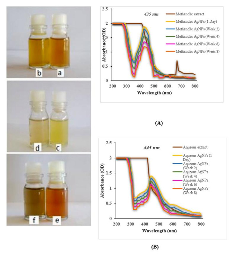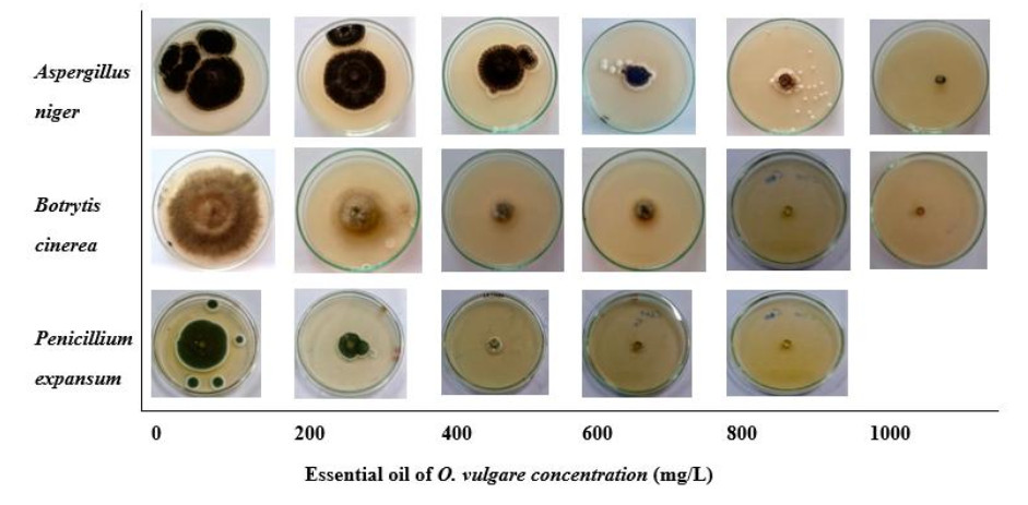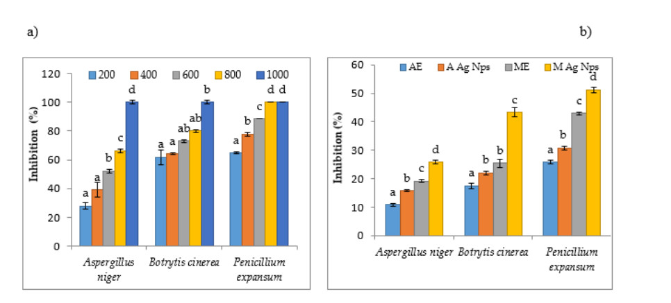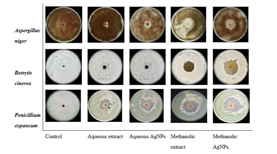 • Aromatic plant essential oils (EO) and their derivatives are promising, eco-friendly alternatives for fungal disease management in plants due to their low toxicity and environmental compatibility. However, practical applications are often limited by challenges such as high volatility, poor water solubility, and inefficient dispersion. To address these limitations, we developed an innovative approach to enhance the stability and antimicrobial efficacy of Origanum vulgare extracts through the green synthesis of silver nanoparticles (AgNPs). The synthesized AgNPs were characterized using UV-Vis spectroscopy and scanning electron microscopy (SEM). UV-Vis analysis revealed characteristic surface plasmon resonance (SPR) peaks at 445 nm (aqueous AgNPs) and 435nm (methanolic AgNPs), confirming nanoparticle formation. The aqueous extract exhibited the highest total phenolic content (50.3 ± 1 mg gallic acid/g), while methanolic AgNPs demonstrated the strongest antioxidant activity, scavenging 89.7 ± 0.2% of DPPH radicals with an IC50 of 19.6 ± 0.3 µg/cm³. The antifungal activity of O. vulgare essential oil, AgNPs, and crude extracts was evaluated against Aspergillus niger, Botrytis cinerea, and Penicillium expansum. GC-MS analysis identified carvacrol (56.53%), thymol (21.18%), p-cymene (6.22%), and γ-terpinene (5.67%) as the major EO constituents. We are the first to report the green synthesis of AgNPs using O. vulgare extracts with comparative evaluation against crude extracts and essential oils for enhanced antifungal application. This study presents a significant advancement in fungal control strategies by demonstrating that AgNPs synthesized from O. vulgare extracts not only retain the high antifungal and antioxidant properties of the essential oil but also overcome its limitations through improved stability, water solubility, and dispersion. The findings suggest that AgNPs synthesized from O. vulgare are a more effective and sustainable alternative to conventional essential oils for combating fungal pathogens in agricultural and post-harvest applications.